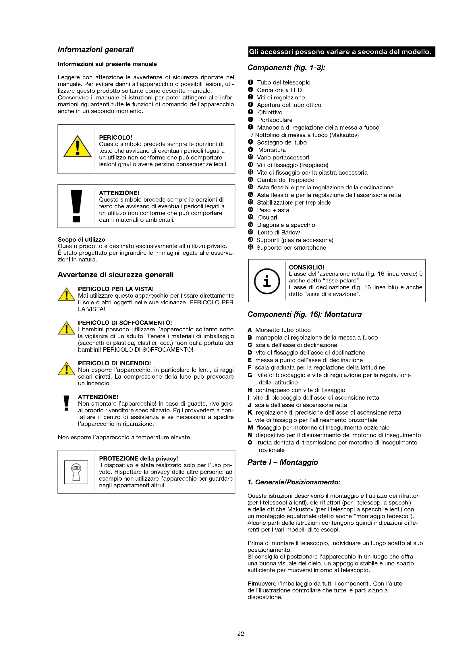 Queste istruzioni descrivono il montaggio e l'utilizzo dei rifrattori (per i telescopi a lenti), die riflettori (per i telescopi a specchi) e delle ottiche Makustov (per i telescopi a specchi e lenti) con un montaggio equatoriale (detto anche "montaggio tedesco"). Alcune parti delle istruzioni contengono quindi indicazioni diffe- renti per i vari modelli di telescopi. Prima di montare il telescopio, individuare un luogo adatto al suo posizionamento. Si consiglia di posizionare l’apparecchio in un luogo che offra una buona visuale del cielo, un appoggio stabile e uno spazio sufficiente per muoversi intorno al telescopio. Rimuovere l’imballaggio da tutti i componenti. Con l’aiuto dell’illustrazione controllare che tutte le parti siano a disposizione.- 23 -