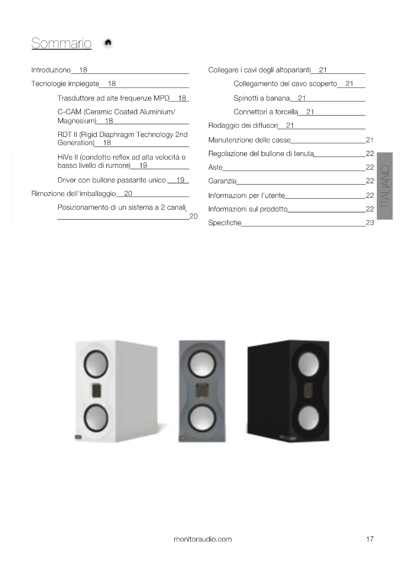 Collegare i cavi degli altoparlanti 21 Collegamento del cavo scoperto 21 Spinotti a banana 21 Connettori a forcella 21 Rodaggio dei diffusori 21 Manutenzione delle casse 21 Regolazione del bullone di tenuta 22 Aste 22 Garanzia 22 Informazioni per l’utente 22 Informazioni sul prodotto 22 Specifiche 23 ITALIANO monitoraudio.com 17Introduzione Studio è un sistema di altoparlanti a elevate prestazioni per gli appassionati di musica che cercano la performance assoluta in una dotazione compatta e conveniente. L’idea di design senza compromessi essenzialmente abbraccia la tecnologia dei driver che si è gradualmente affermata con la nostra serie di punta Platinum II. Ogni singolo dettaglio della catena del segnale è stato considerato per ottenere la neutralità, richiedendo al nostro team di progettazione di ragionare in modo assolutamente rigoroso. Il design privo di griglia, ad esempio, assicura un funzionamento dell’altoparlante a livelli sempre ottimali, senza alcuna concessione. Le aste da pavimento regolabili sono state create per realizzare il miglior basamento possibile, capace di comporre design e prestazioni in modo impeccabile. Tecnologie impiegate Trasduttore ad alte frequenze MPD È stato progettato un trasduttore ad alte frequenze MPD (Micro Pleated Diaphragm) che consente di offrire un’incredibile articolazione grazie alla massa ridotta del diaframma. Il trasduttore MPD funziona stringendo velocemente le plissettature del diaframma per produrre una risposta regolare, ampia e naturalmente veloce fino alla banda ultrasonica. Il suono che ne risulta è più realistico, con il rilascio dello spettro armonico elevato di ciascuna nota evitando la distorsione che ridurrebbe la definizione. C-CAM (Ceramic Coated Aluminium/Magnesium) C-CAM è una lega innovativa originariamente sviluppata per l'industria aerospaziale. Estremamente rigida e allo stesso tempo abbastanza leggera da non compromettere l'efficienza globale, questa lega presenta le qualità ideali per i coni degli altoparlanti. C-CAM è una lega di alluminio e magnesio, che durante la fabbricazione subisce processi di distensione che evitano la deformazione superficiale e la debolezza molecolare. Uno strato di ceramica pura (ossido di alluminio) viene posato sulle superfici per ottenere una superficie esterna completamente rigida. I coni in C-CAM sono progettati per avere una resistenza elevata alle sollecitazioni di flessione. La C-CAM, lavorata per formare un cono, offre una miglior chiarezza e una minor distorsione rispetto ai materiali normalmente utilizzati per produrre i coni. RDT II (Rigid Diaphragm Technology 2nd Generation) RDT II è una struttura composita a “sandwich”, realizzata con rivestimenti sottilissimi di massa ridotta, applicati a un nucleo centrale a nido d’ape in NomexR. Lo spessore totale del diaframma RDT II è di soli 2 mm, ma sviluppa una forza 150 volte superiore ai normali coni di altoparlanti. RDT II è una realizzazione esclusiva e innovativa, concepita dagli ingegneri di Monitor Audio per la nuova serie Platinum II. Utilizza due materiali di rivestimento, con proprietà meccaniche diverse: per il rivestimento anteriore viene utilizzata la lega C-CAM, mentre il rivestimento posteriore è realizzato con un tessuto in fibra di carbonio. Questa combinazione è in grado di ridurre la distorsione di oltre 8 dB sopra i 300 Hz, che equivale al 60% di riduzione dell’energia delle componenti armoniche: la tecnologia RDT II è quindi quella che consente la produzione di coni con la distorsione più bassa della storia di Monitor Audio. I driver RDT II di tipo dual a 4” utilizzati da Studio sono stati sviluppati a partire dal modello PL500 II, in questo caso modificato per la produzione dei toni bassi e medi. Viene inoltre utilizzata la tecnologia DCF (Dynamic Coupling Filter, Filtro di accoppiamento dinamico) per ottimizzare e ridurre il break-up dei coni alle alte frequenze e per incrementare la rigidità circonferenziale critica della bobina mobile. Come nel modello Platinum II, i driver di Studio sono stati progettati per garantire una distorsione incredibilmente bassa e per utilizzare gli stessi principi di progettazione magnetica. Studio18HiVe II (condotto reflex ad alta velocità e basso livello di rumore) Si tratta di un nuovo tipo di tecnologia per il condotto che utilizza nervature radiali progettate per accelerare il flusso d’aria e ridurre la turbolenza. La tecnologia HiVe II consente di spostare l’aria in ingresso e in uscita in modo molto più rapido rispetto ai condotti tradizionali; ne risultano così bassi veloci e potenti, oltre che una risposta superiore ai transienti. La cassa ultrasottile di Studio è ottimizzata con l’utilizzo di due condotti posteriori HiVe II montati nella parte superiore e inferiore della cassa: questa soluzione assicura il bilanciamento simmetrico della pressione all’interno della cassa. L’ampia superficie del condotto assicura inoltre l’assenza di turbolenze e della conseguente rumorosità dell’aria che, nelle casse di piccole dimensioni, può costituire un problema. Driver con bullone passante unico Studio utilizza il nostro esclusivo sistema driver con bullone passante unico, che si aggancia dalla parte posteriore della cassa. Fissato con uno specifico momento di serraggio, il sistema serve a fornire al driver una forza di bloccaggio omogenea nelle zone periferiche, assicurando il bloccaggio del sistema motore. Poiché questo è essenzialmente un sistema di bloccaggio aggiuntivo, la cassa e i driver, una volta installati, diventano ancora più saldi. ITALIANO monitoraudio.com 19Rimozione dell'imballaggio Assicurarsi di disporre di una superficie a terra di dimensioni sufficienti, quindi seguire le istruzioni grafiche riportate sull’imballo di cartone. Tagliare il nastro che sigilla il cartone, facendo attenzione a non tagliare più in profondità dello spessore del nastro, aprire i lembi superiori della scatola e liberare il polist