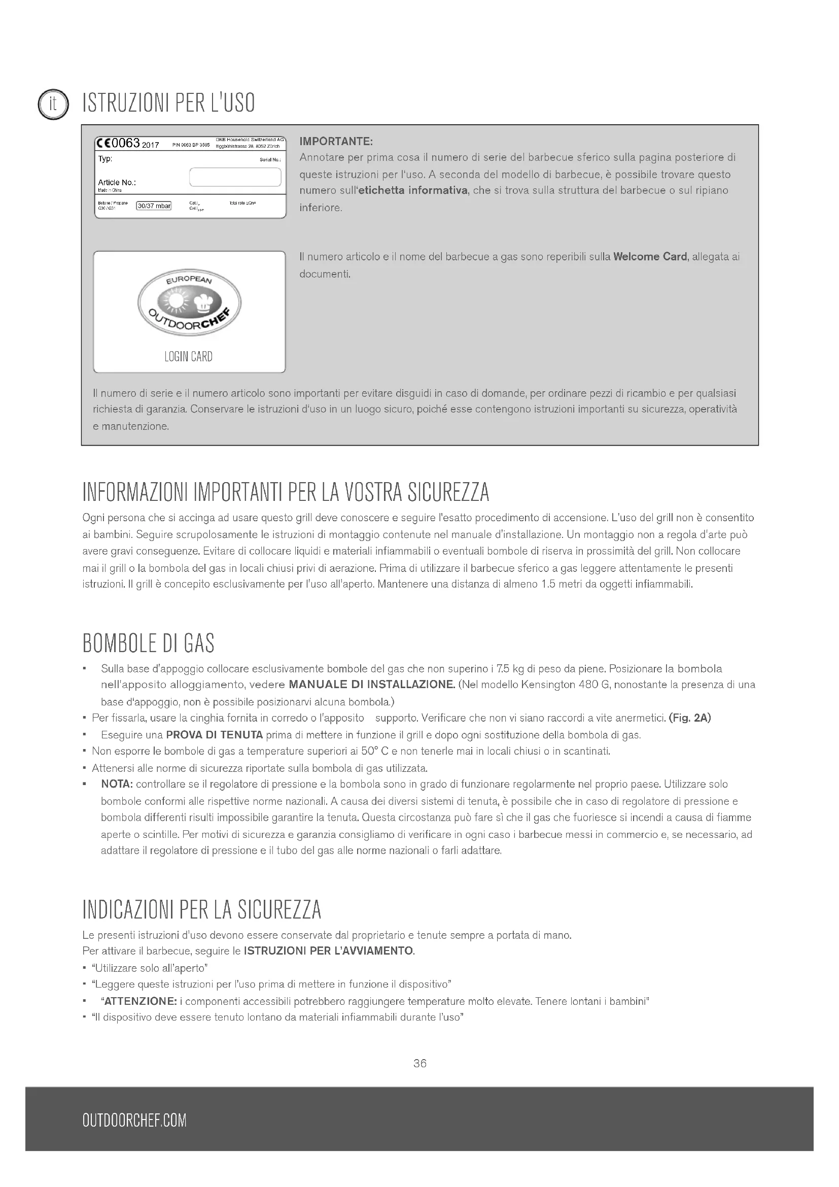 Le presenti istruzioni d'uso devono essere conservate dal proprietario e tenute sempre a portata di mano.Per attivare il barbecue, seguire le ISTRUZIONI PER L’AVVIAMENTO.• “Utilizzare solo all’aperto”• “Leggere queste istruzioni per l’uso prima di mettere in funzione il dispositivo”