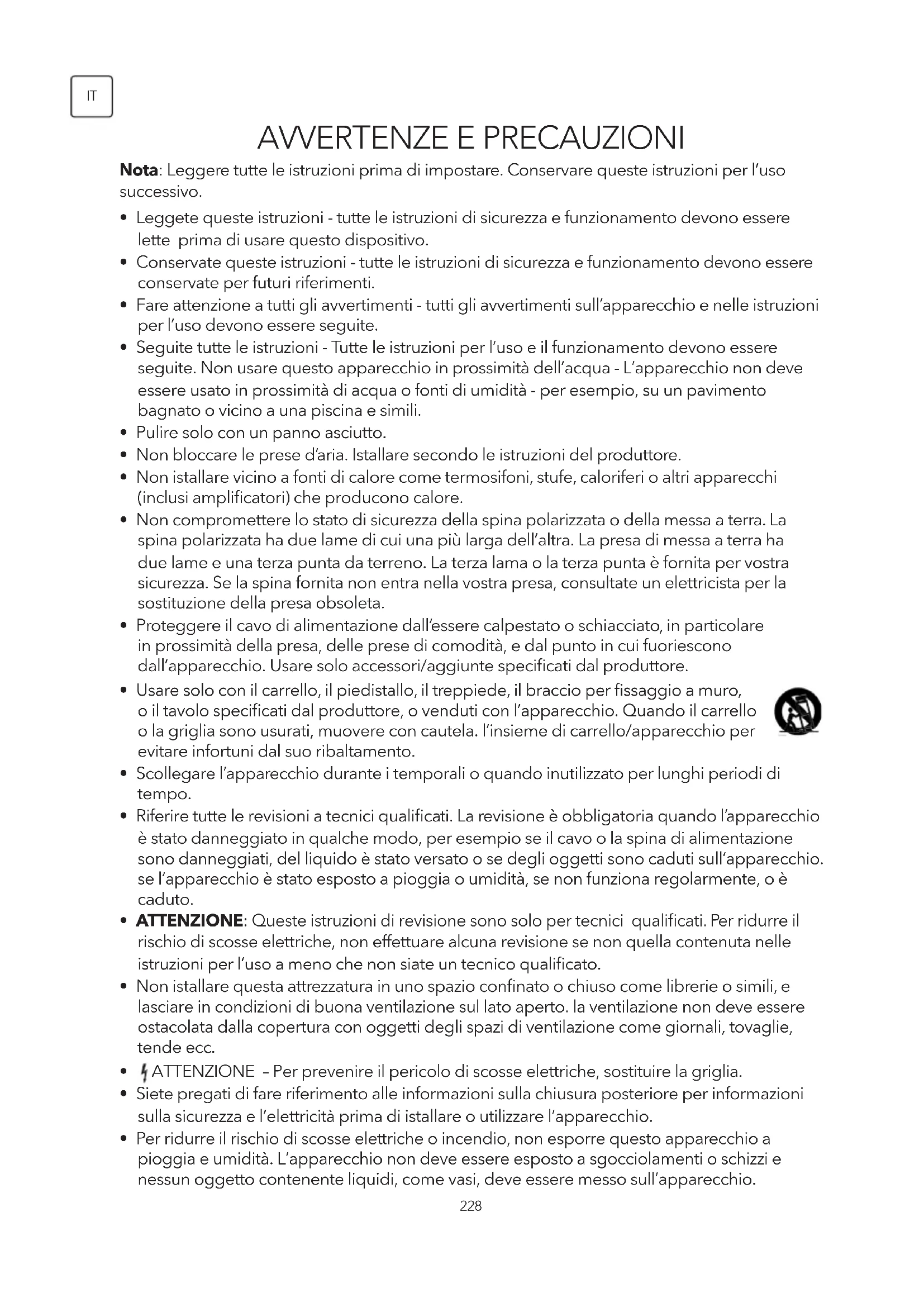 - Per ridurre il rischio di scosse elettriche o incendio, non esporre questo apparecchio a pioggia e umidità. L’apparecchio non deve essere esposto a sgocciolamenti o schizzi e nessun oggetto contenente liquidi, come vasi, deve essere messo sull’apparecchio.229