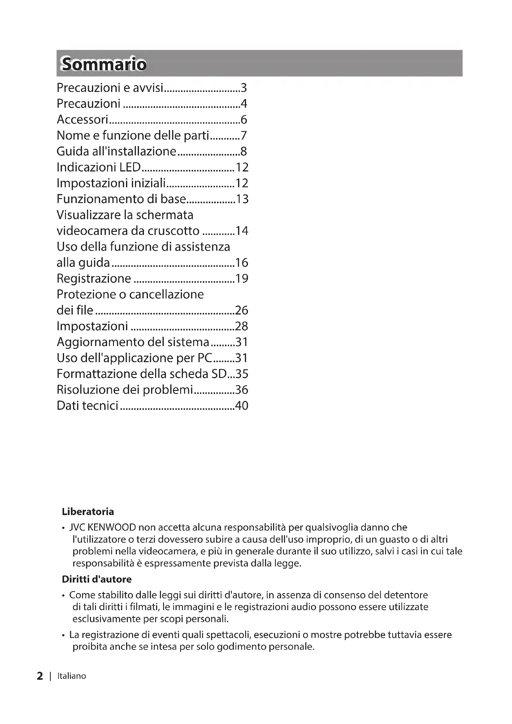 - JVC KENWOOD non accetta alcuna responsabilità per qualsivoglia danno che l'utilizzatore o terzi dovessero subire a causa dell'uso improprio, di un guasto o di altri problemi nella videocamera, e più in generale durante il suo utilizzo, salvi i casi in cui tale responsabilità è espressamente prevista dalla legge. Diritti d'autore