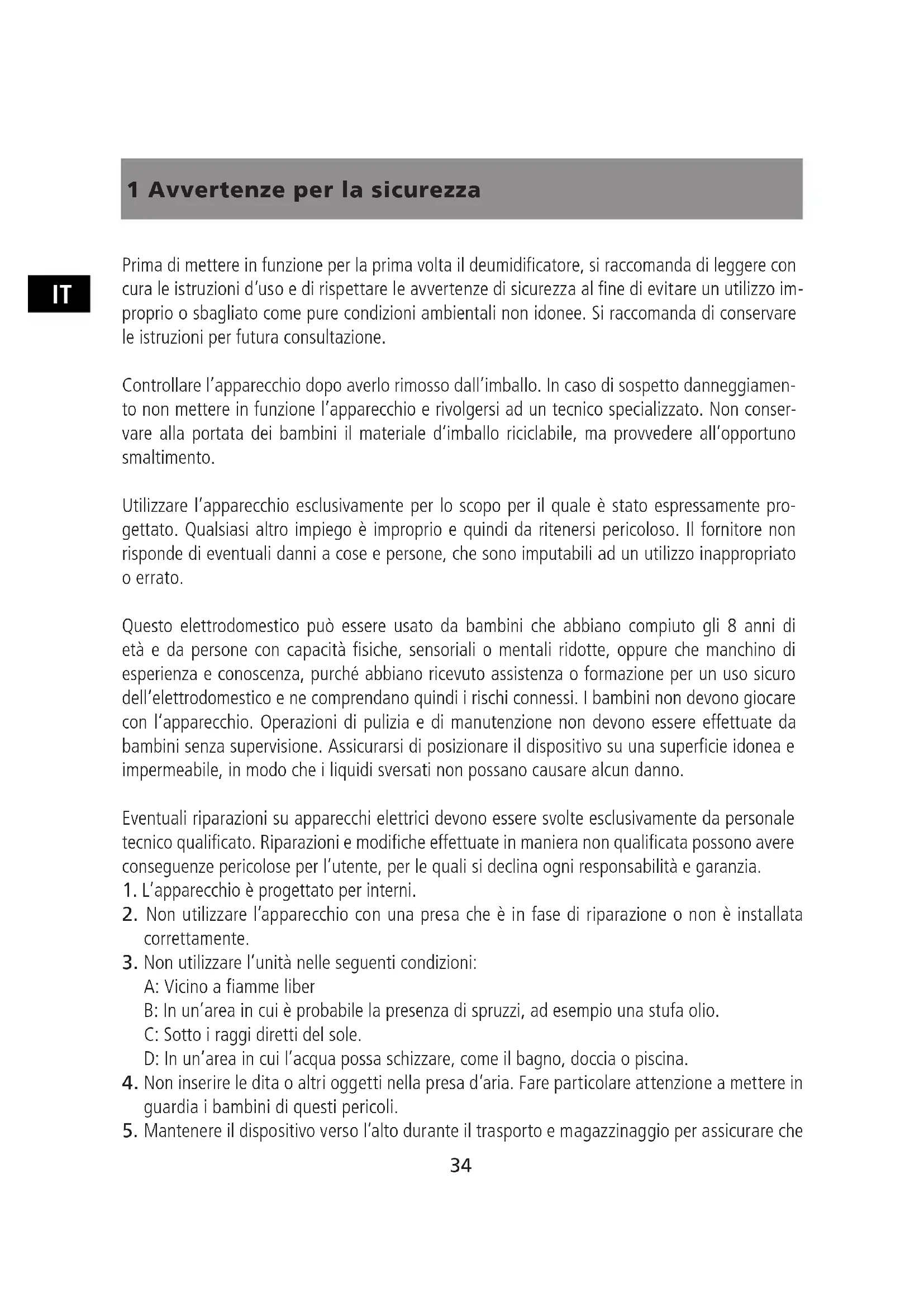 1 Avvertenze per la sicurezza Prima di mettere in funzione per la prima volta il deumidificatore, si raccomanda di leggere con cura le istruzioni d’uso e di rispettare le avvertenze di sicurezza al fine di evitare un utilizzo im- proprio o sbagliato come pure condizioni ambientali non idonee. Si raccomanda di conservare le istruzioni per futura consultazione. Controllare l’apparecchio dopo averlo rimosso dall’imballo. In caso di sospetto danneggiamen- to non mettere in funzione l’apparecchio e rivolgersi ad un tecnico specializzato. Non conser- vare alla portata dei bambini il materiale d’imballo riciclabile, ma provvedere all’opportuno smaltimento. Utilizzare l’apparecchio esclusivamente per lo scopo per il quale è stato espressamente pro- gettato. Qualsiasi altro impiego è improprio e quindi da ritenersi pericoloso. Il fornitore non risponde di eventuali danni a cose e persone, che sono imputabili ad un utilizzo inappropriato o errato. Questo elettrodomestico può essere usato da bambini che abbiano compiuto gli 8 anni di età e da persone con capacità fisiche, sensoriali o mentali ridotte, oppure che manchino di esperienza e conoscenza, purché abbiano ricevuto assistenza o formazione per un uso sicuro dell‘elettrodomestico e ne comprendano quindi i rischi connessi. I bambini non devono giocare con l‘apparecchio. Operazioni di pulizia e di manutenzione non devono essere effettuate da bambini senza supervisione. Assicurarsi di posizionare il dispositivo su una superficie idonea e impermeabile, in modo che i liquidi sversati non possano causare alcun danno. Eventuali riparazioni su apparecchi elettrici devono essere svolte esclusivamente da personale tecnico qualificato. Riparazioni e modifiche effettuate in maniera non qualificata possono avere conseguenze pericolose per l’utente, per le quali si declina ogni responsabilità e garanzia.