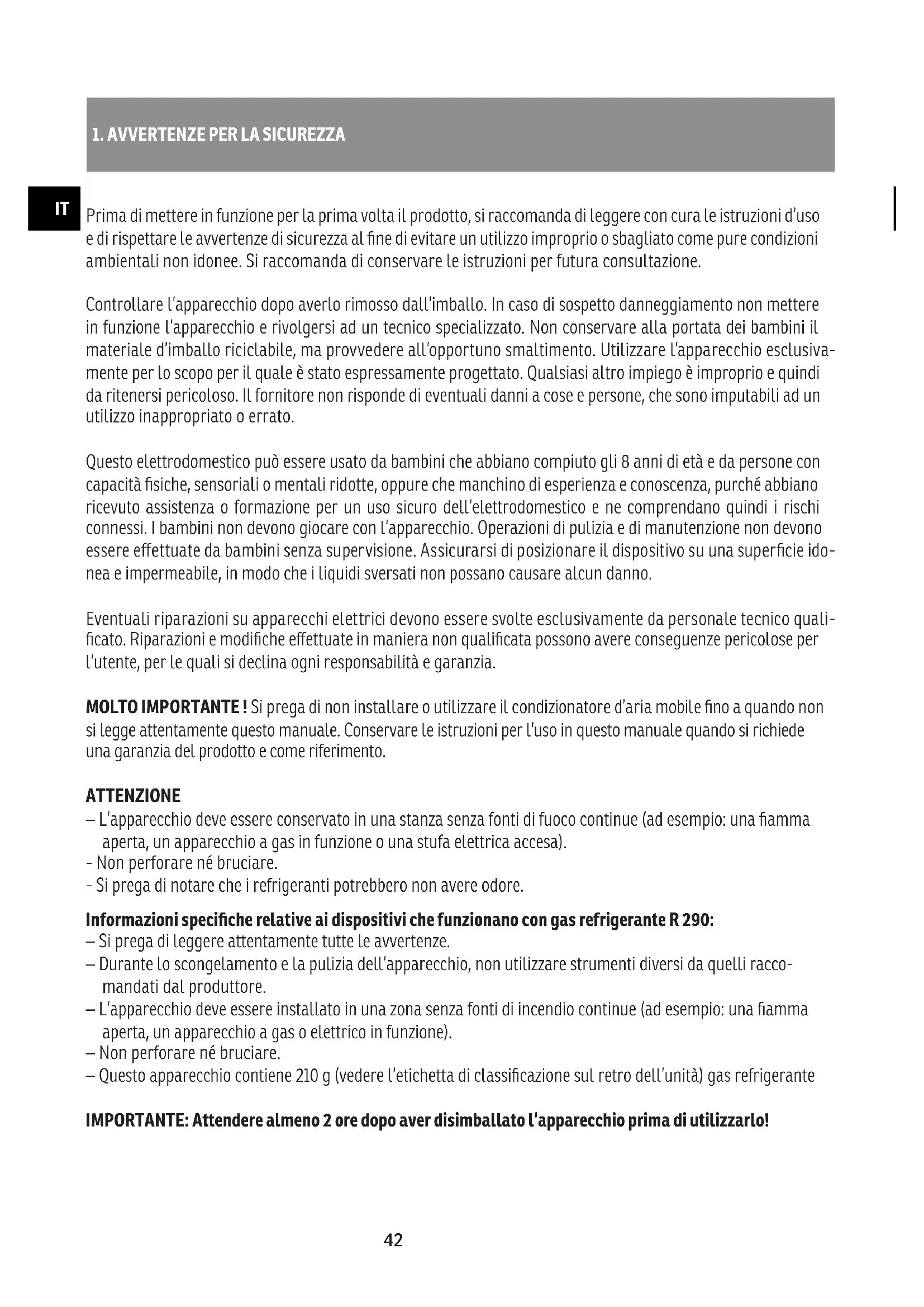 Indice 1 Avvertenze per la sicurezza42 2 Nominazione delle parti 46 3 Accessori 46 4 Pannello di controllo, telecomando e WLAN 47 5 Utilizzo 51 6 Pulizia e manutenzione 54 7 Risoluzione dei problemi 55 8 Garanzia / Smaltimento / Modifiche tecniche 5642 Prima di mettere in funzione per la prima volta il prodotto, si raccomanda di leggere con cura le istruzioni d’uso e di rispettare le avvertenze di sicurezza al fine di evitare un utilizzo improprio o sbagliato come pure condizioni ambientali non idonee. Si raccomanda di conservare le istruzioni per futura consultazione. Controllare l’apparecchio dopo averlo rimosso dall’imballo. In caso di sospetto danneggiamento non mettere in funzione l’apparecchio e rivolgersi ad un tecnico specializzato. Non conservare alla portata dei bambini il materiale d’imballo riciclabile, ma provvedere all’opportuno smaltimento. Utilizzare l’apparecchio esclusiva- mente per lo scopo per il quale è stato espressamente progettato. Qualsiasi altro impiego è improprio e quindi da ritenersi pericoloso. Il fornitore non risponde di eventuali danni a cose e persone, che sono imputabili ad un utilizzo inappropriato o errato. Questo elettrodomestico può essere usato da bambini che abbiano compiuto gli 8 anni di età e da persone con capacità fisiche, sensoriali o mentali ridotte, oppure che manchino di esperienza e conoscenza, purché abbiano ricevuto assistenza o formazione per un uso sicuro dell‘elettrodomestico e ne comprendano quindi i rischi connessi. I bambini non devono giocare con l‘apparecchio. Operazioni di pulizia e di manutenzione non devono essere effettuate da bambini senza supervisione. Assicurarsi di posizionare il dispositivo su una superficie ido- nea e impermeabile, in modo che i liquidi sversati non possano causare alcun danno. Eventuali riparazioni su apparecchi elettrici devono essere svolte esclusivamente da personale tecnico quali- ficato. Riparazioni e modifiche effettuate in maniera non qualificata possono avere conseguenze pericolose per l’utente, per le quali si declina ogni responsabilità e garanzia. MOLTO IMPORTANTE ! Si prega di non installare o utilizzare il condizionatore d’aria mobile fino a quando non si legge attentamente questo manuale. Conservare le istruzioni per l’uso in questo manuale quando si richiede una garanzia del prodotto e come riferimento. ATTENZIONE – L’apparecchio deve essere conservato in una stanza senza fonti di fuoco continue (ad esempio: una fiamma aperta, un apparecchio a gas in funzione o una stufa elettrica accesa). - Non perforare né bruciare. - Si prega di notare che i refrigeranti potrebbero non avere odore. Informazioni specifiche relative ai dispositivi che funzionano con gas refrigerante R 290: – Si prega di leggere attentamente tutte le avvertenze. – Durante lo scongelamento e la pulizia dell’apparecchio, non utilizzare strumenti diversi da quelli racco- mandati dal produttore. – L’apparecchio deve essere installato in una zona senza fonti di incendio continue (ad esempio: una fiamma aperta, un apparecchio a gas o elettrico in funzione). – Non perforare né bruciare. – Questo apparecchio contiene 210 g (vedere l’etichetta di classificazione sul retro dell’unità) gas refrigerante