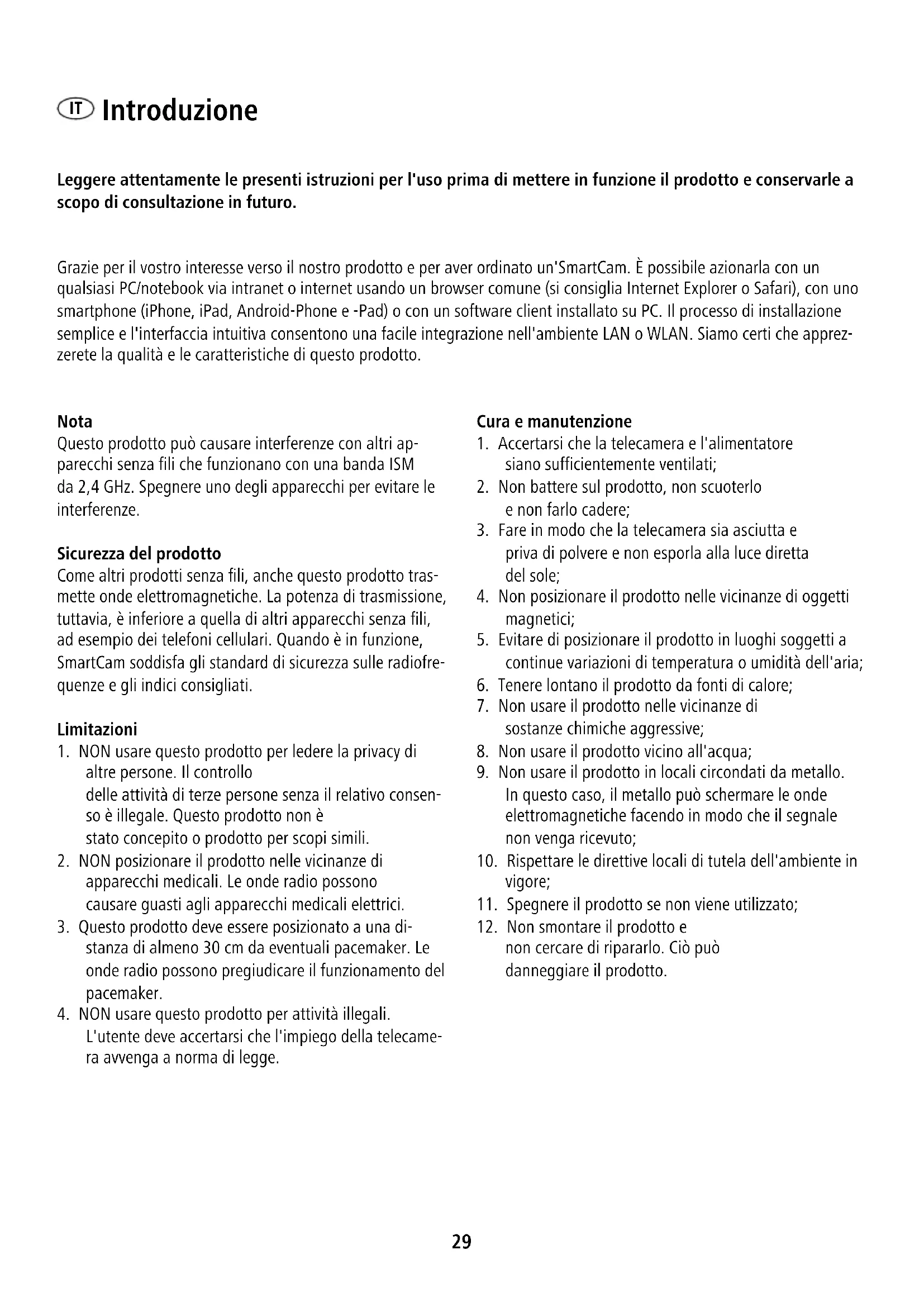 Grazie per il vostro interesse verso il nostro prodotto e per aver ordinato un'SmartCam. è possibile azionaria con un qualsiasti PC/notesbook via intranet o internet usando un browser comune (si consiglia Internet Explorer o Safari), con uno smartphone (iPhone, iPad, Android-Phone e -Pad) o con un software client installato su PC. Il processo di installmente semplice e l'interfaccia intuitiva consentono una facile integrazione nell'ambiente LAN o WLAN. Siamo certi che apprezzerete la qualità e le caratteristiche di quello prodotto.