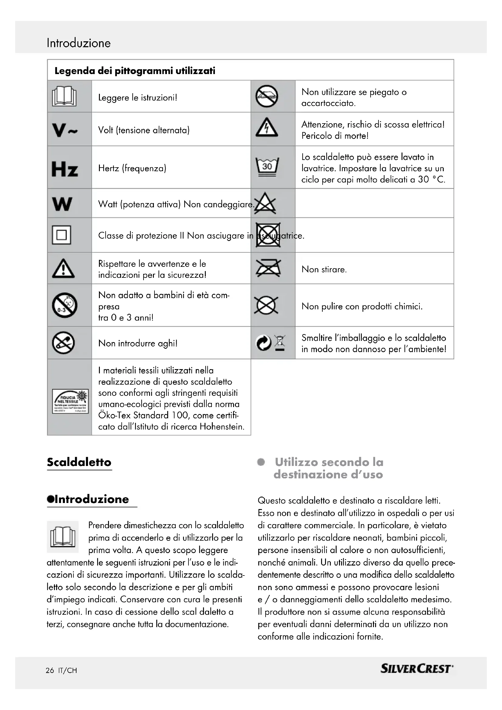 RIALE! Quando lo scaldaletto non viene utilizzato, non porre su di esso alcun oggetto, per impedire che lo scaldaletto venga piegato in modo netto. In caso contrario il prodotto potrebbe essere danneggiato. Se lo scaldaletto non viene utilizzato per lungo tempo, conservarlo nella sua confezione origi- nale, in ambiente asciutto e senza appoggiarvi sopra oggetti pesanti. Smaltimento L‘imballaggio e realizzato in materiali non dannosi per l‘ambiente. Smaltirlo nei contenitori locali di raccolta di materiale destinato al riciclaggio. Non gettare apparecchi elettrici nella spazzatura domestica!33 IT/CH Smaltimento / Garanzia / Assistenza / Dichiarazione di conformità Ai sensi della Direttiva Europea sullo smaltimento di apparecchi elettrici ed elettronici usati e della legi- slazione nazionale che recepisce tale direttiva, gli apparecchi elettrici usati devono essere raccolti se- paratamente e inviati a un impianto di riciclaggio non dannoso per l‘ambiente. Informarsi presso l’amministrazione cittadina o comunale sulle possibilità di uno smaltimento ecologico e corretto dello scaldaletto usato. Garanzia / Assistenza Forniamo una garanzia di 3 anni dalla data di acquisto per difetto di materiale e di fabbricazione dello scaldaletto. La garanzia non è valida nei seguenti casi: