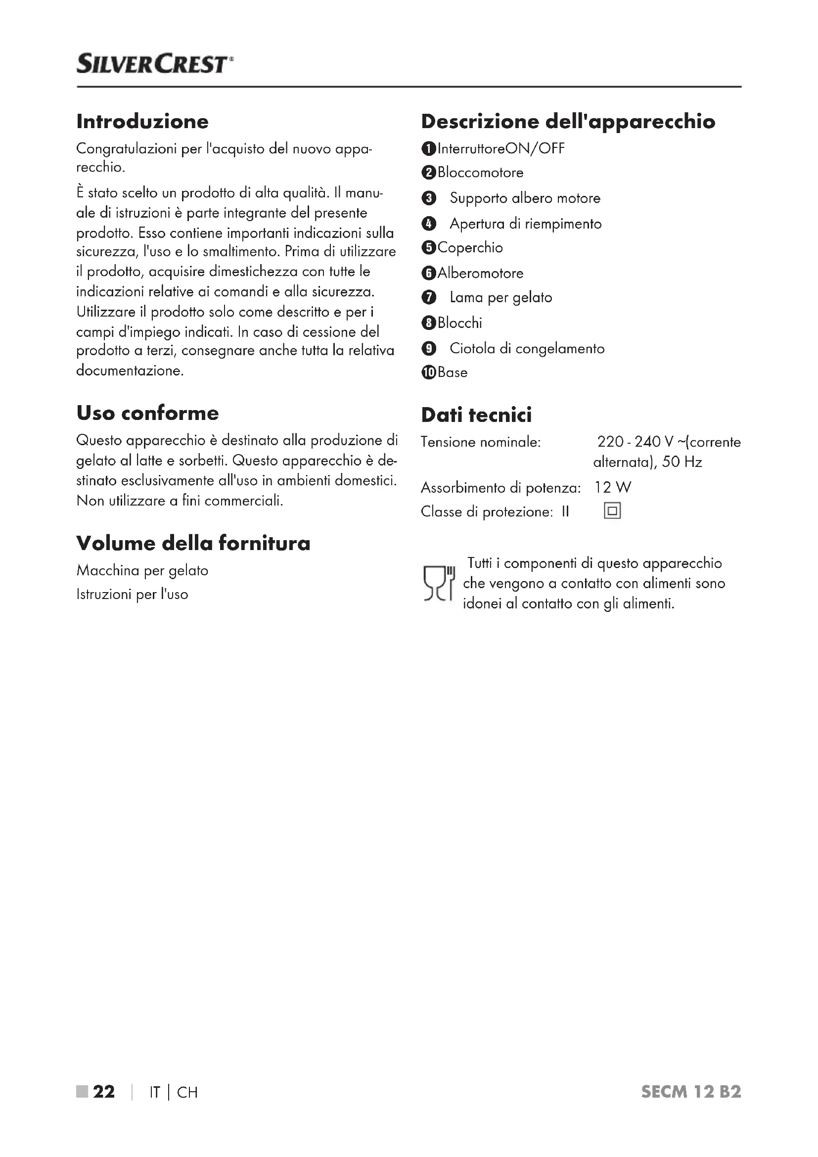 Introduzione Congratulazioni per l'acquisto del nuovo appa- recchio. È stato scelto un prodotto di alta qualità. Il manu- ale di istruzioni è parte integrante del presente prodotto. Esso contiene importanti indicazioni sulla sicurezza, l'uso e lo smaltimento. Prima di utilizzare il prodotto, acquisire dimestichezza con tutte le indicazioni relative ai comandi e alla sicurezza. Utilizzare il prodotto solo come descritto e per i campi d'impiego indicati. In caso di cessione del prodotto a terzi, consegnare anche tutta la relativa documentazione. Uso conforme Questo apparecchio è destinato alla produzione di gelato al latte e sorbetti. Questo apparecchio è de- stinato esclusivamente all'uso in ambienti domestici. Non utilizzare a fini commerciali. Volume della fornitura Macchina per gelato Istruzioni per l'uso Descrizione dell'apparecchio 1 Interruttore ON/OFF 2 Blocco motore 3 Supporto albero motore 4 Apertura di riempimento 5 Coperchio 6 Albero motore 7 Lama per gelato 8 Blocchi 9 Ciotola di congelamento 0 Base Dati tecnici Tensione nominale: