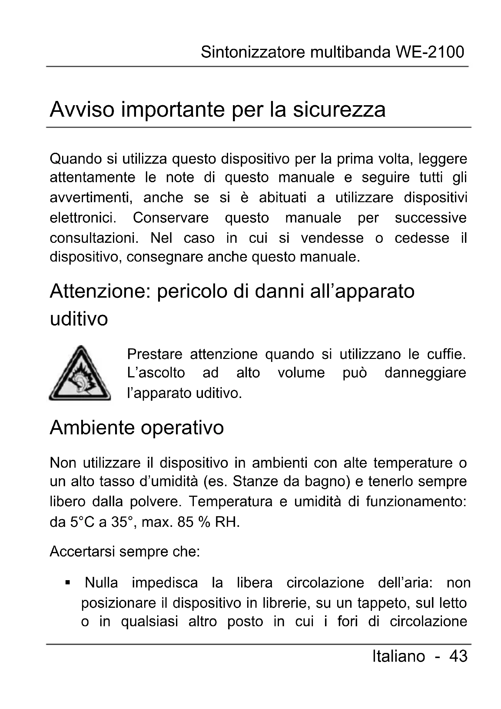 - Dettagli della garanzia Sintonizzatore multibanda WE-2100 Italiano - 43 Avviso importante per la sicurezza Quando si utilizza questo dispositivo per la prima volta, leggere attentamente le note di questo manuale e seguire tutti gli avvertimenti, anche se si è abituati a utilizzare dispositivi elettronici. Conservare questo manuale per successive consultazioni. Nel caso in cui si vendesse o cedesse il dispositivo, consegnare anche questo manuale. Attenzione: pericolo di danni all’apparato uditivo Prestare attenzione quando si utilizzano le cuffie. L’ascolto ad alto volume può danneggiare l’apparato uditivo. Ambiente operativo Non utilizzare il dispositivo in ambienti con alte temperature o un alto tasso d’umidità (es. Stanze da bagno) e tenerlo sempre libero dalla polvere. Temperatura e umidità di funzionamento: da 5°C a 35°, max. 85 % RH. Accertarsi sempre che: Nulla impedisca la libera circolazione dell’aria: non posizionare il dispositivo in librerie, su un tappeto, sul letto o in qualsiasi altro posto in cui i fori di circolazioneSintonizzatore multibanda WE-2100 p. 58