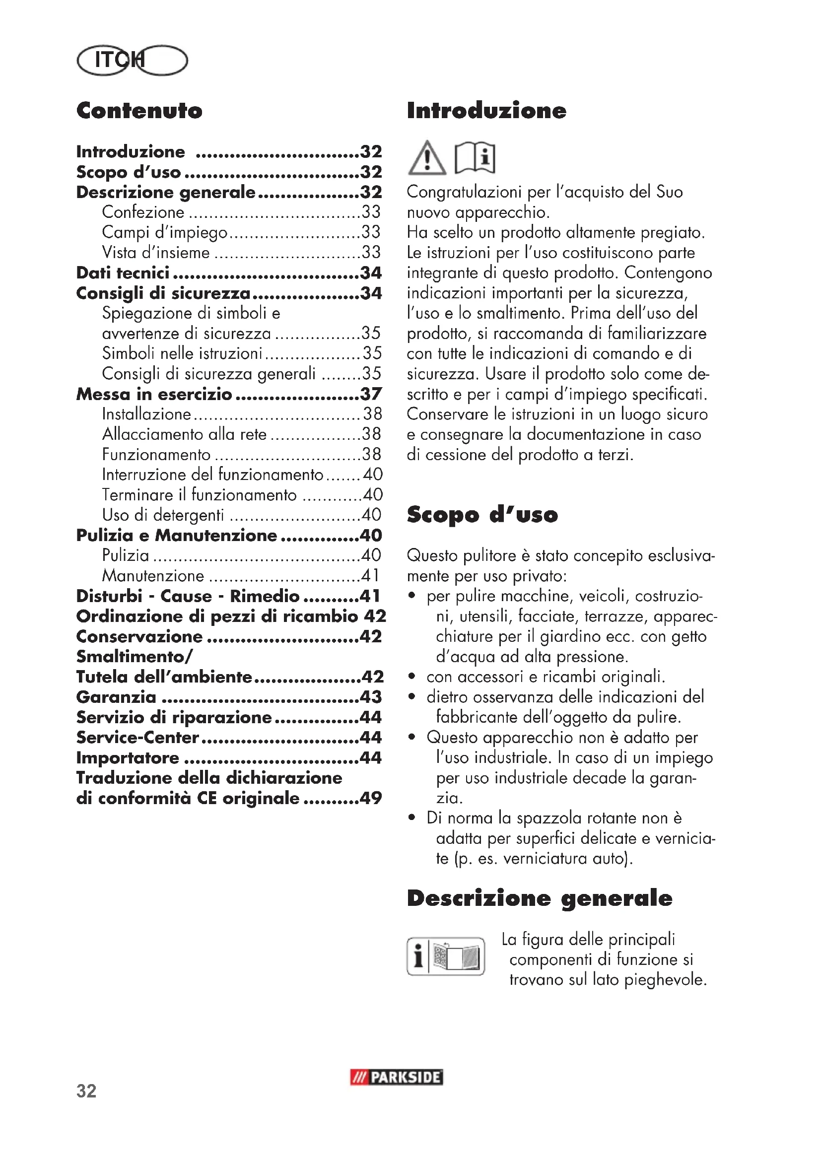 - Di norma la spazzola rotante non è adatta per superci delicate e vernicia- te (p. es. verniciatura auto). Descrizione generale La gura delle principali componenti di funzione si trovano sul lato pieghevole. Contenuto Introduzione .............................32 Scopo d’uso ...............................32 Descrizione generale ..................32 Confezione ..................................33 Campi d’impiego ..........................33 Vista d’insieme .............................33 Dati tecnici .................................34 Consigli di sicurezza ...................34 Spiegazione di simboli e avvertenze di sicurezza .................35 Simboli nelle istruzioni ................... 35 Consigli di sicurezza generali ........35 Messa in esercizio ......................37 Installazione ................................. 38 Allacciamento alla rete ..................38 Funzionamento .............................38 Interruzione del funzionamento ....... 40 Terminare il funzionamento ............40 Uso di detergenti ..........................40 Pulizia e Manutenzione ..............40 Pulizia .........................................40 Manutenzione ..............................41 Disturbi - Cause - Rimedio ..........41 Ordinazione di pezzi di ricambio 42 Conservazione ...........................42 Smaltimento/ Tutela dell’ambiente ...................42 Garanzia ...................................43 Servizio di riparazione ...............44 Service-Center ............................44 Importatore ...............................44 Traduzione della dichiarazione di conformità CE originale ..........4933 CHIT 5 Tubo essibile alta pressione su tamburo tubo essibile) 6 Manovella per tamburo tubo essibile 7 Interruttore accensione/ spegnimento 8 Pulsante di regolazione 9 Contenitore detergente con ugello 10 Supporto per cavo di alimentazione 11 Cavo di alimentazione 12 Rotelle 13 Raccordo attacco acqua con in- serto setaccio 14 Attacco dell’acqua 15 Supporto per pistola a spruzzo 16 Pistola a spruzzo 17 Supporto accessori (non a vista) 18 Tubo del getto con ugello a getto piatto (ugello standard) 19 Ago pulizia ugello (non a vista) 20 Tubo di irradiazione 21 Leva di accensione 22 Leva di bloccaggio 23 Bloccaggio 24 Tubo del getto con ugello dell’al- ta pressione (fresa turbo per asportare lo sporco) 25 Attacco rapido per adattatore tubo da giardino 26 Attacco alta pressione 27 Pulsante di sblocco 28 Attacco alta pressione lato pistola 29 Detergente
