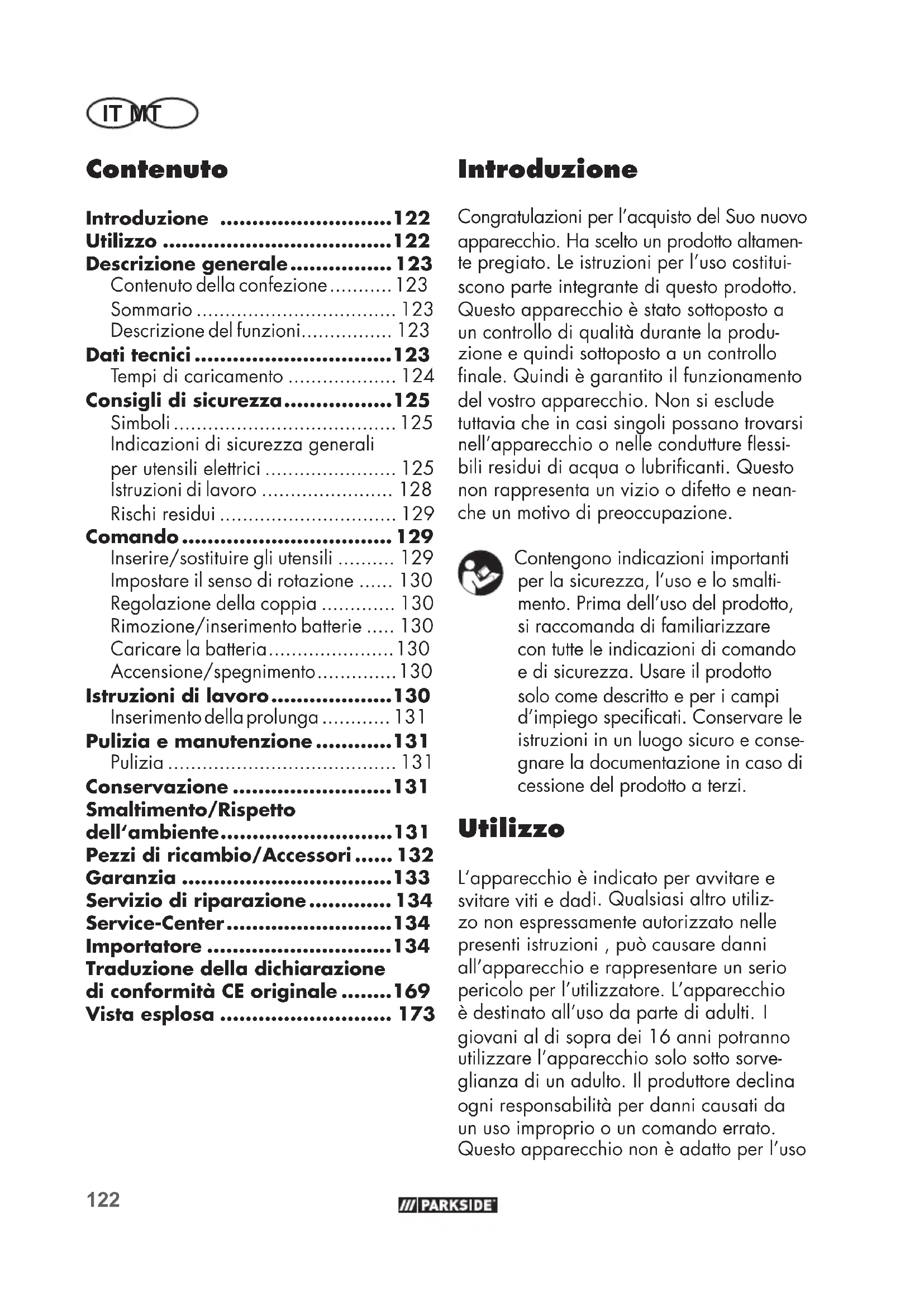 a) Tenere la zona di lavoro pulita e ben illuminata. Disordine o zone di lavoro non sufcientemente illuminate possono causare infortuni. b) Non lavorare con l‘utensile elet- trico in un ambiente a rischio di esplosioni, nel quale sono presenti liquidi, gas o polveri in- ammabili. Utensili elettrici generano scintille che possono inammare la pol- vere o i vapori. c) Tenere bambini e altre persone lontane durante l‘uso dell‘u- tensile. In caso di distrazioni si può perdere il controllo dell‘apparecchio. Consigli di sicurezza Osservare le indicazioni di sicurezza du- rante l’uso dell’apparecchio. Simboli Simboli nelle istruzioni Simboli dei pericoli con appo- site indicazioni per prevenire danni a persone o cose. Simboli di pericolo con indica- zioni per prevenire danni alle persone dovuti a una scossa elettrica. Simboli dei divieti con indicazioni relative alla prevenzione di danni. Simboli di avvertenza con informa- zioni relative ad un migliore tratta- mento dell’apparecchio. Rafgurazioni sull’apparecchio: Prima dell’uso dell’apparecchio, leggere attentamente e interamente le istruzioni per l’uso. L‘apparecchio fa parte della serie Parkside X20VTEAM Attenzione! Supercie calda. Pericolo di ustioni. Le apparecchiature non si devono smaltire insieme ai riuti domestici.IT MT