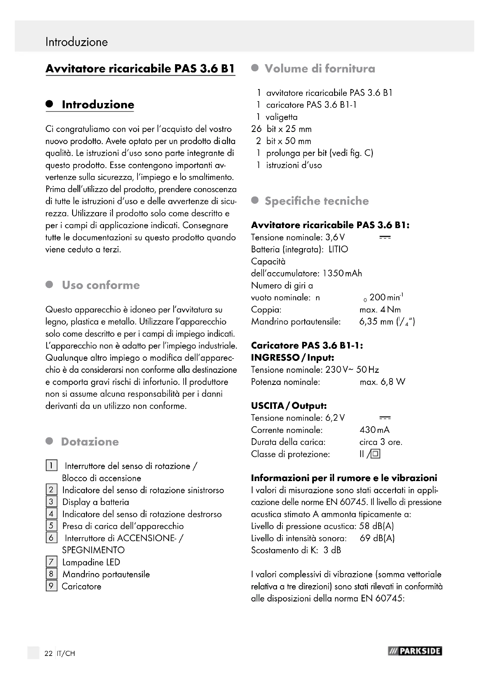 Caricatore PAS 3.6 B1-1: INGRESSO / Input: Tensione nominale: 230 V∼ 50 Hz Potenza nominale: max. 6,8 W USCITA / Output: Tensione nominale: 6,2 V Corrente nominale: 430 mA Durata della carica: circa 3 ore. Classe di protezione: II / Informazioni per il rumore e le vibrazioni I valori di misurazione sono stati accertati in appli- cazione delle norme EN 60745. Il livello di pressione acustica stimato A ammonta tipicamente a: Livello di pressione acustica: 58 dB(A) Livello di intensità sonora: 69 dB(A) Scostamento di K: 3 dB I valori complessivi di vibrazione (somma vettoriale relativa a tre direzioni) sono stati rilevati in conformità alle disposizioni della norma EN 60745: Introduzione23 IT/CH Viti: Valore di emissione di vibrazione