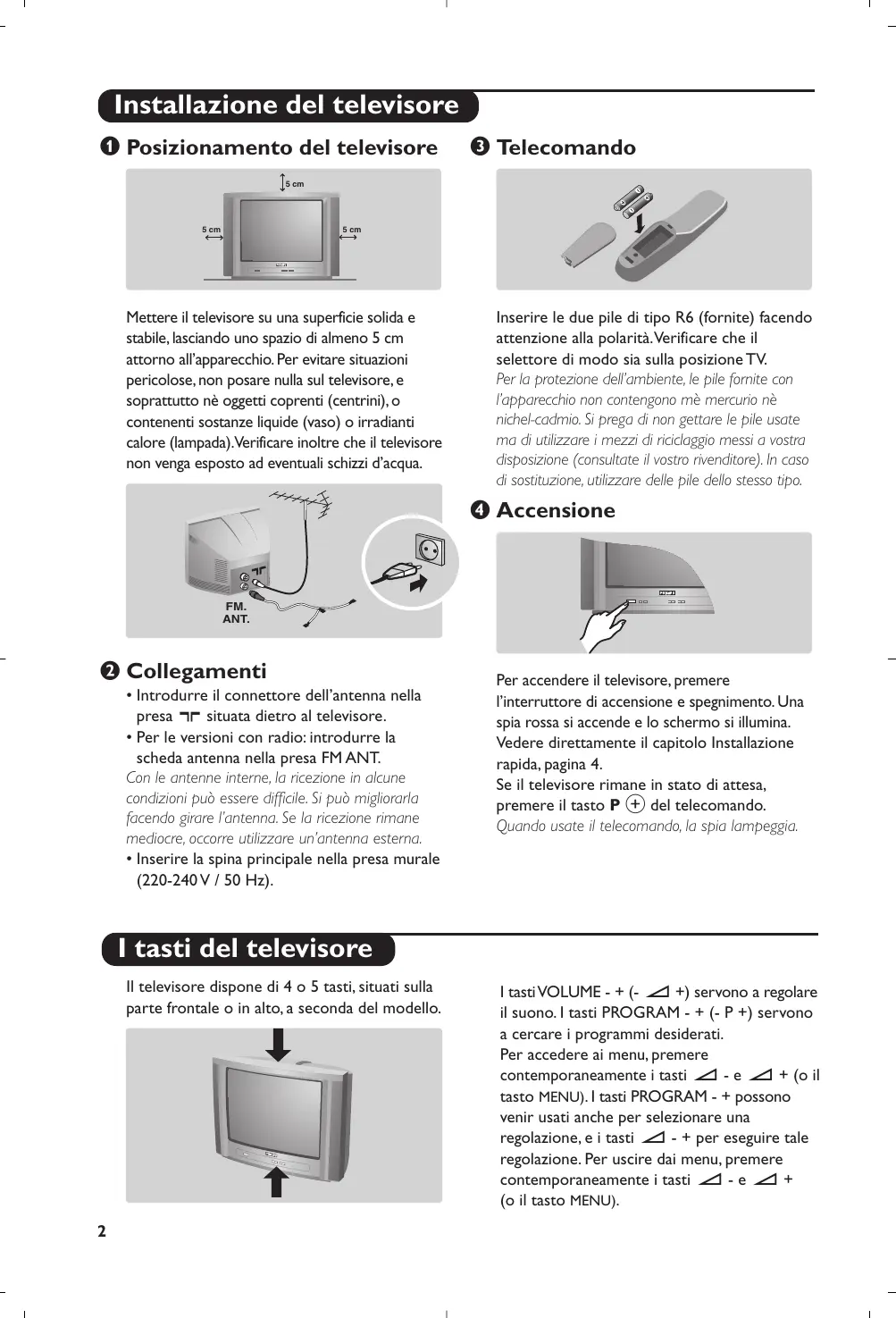 Italiano La ringraziamo per aver acquistato questo televisore. Il presente manualetto è stato concepito per aiutarla ad installare e utilizzare il suo televisore. Le consigliamo vivamente di leggerlo fino in fondo. Ci auguriamo che la nostra tecnologia la soddisfi pienamente. Dichiarazione di conformità Questo apparecchio è fabbricato nella Comunità Economica Europea nel rispetto delle disposizioni di cui al D. M. 26/03/92 ed in particolare è conforme alle prescrizioni dell’art. 1 dello stesso D.M. Si dichiara che l’apparecchio televisori a colori (vedere indicazioni sull’etichetta nel retro della televisione) risponde alle prescrizioni dell’art.2 comma 1 del D.M. 28 Agosto 1995 n. 548. Fatto a Dreux, il Febbraio 2004 P. E.G.P. 1, rue de Réveillon 28104 Dreux France Installazione del televisore & Posizionamento del televisore “ Telecomando 5 cm 5 cm 5 cm Mettere il televisore su una superficie solida e stabile, lasciando uno spazio di almeno 5 cm attorno all’apparecchio. Per evitare situazioni pericolose, non posare nulla sul televisore, e soprattutto nè oggetti coprenti (centrini), o contenenti sostanze liquide (vaso) o irradianti calore (lampada).Verificare inoltre che il televisore non venga esposto ad eventuali schizzi d’acqua. Inserire le due pile di tipo R6 (fornite) facendo attenzione alla polarità.Verificare che il selettore di modo sia sulla posizione TV. Per la protezione dell’ambiente, le pile fornite con l’apparecchio non contengono mè mercurio nè nichel-cadmio. Si prega di non gettare le pile usate ma di utilizzare i mezzi di riciclaggio messi a vostra disposizione (consultate il vostro rivenditore). In caso di sostituzione, utilizzare delle pile dello stesso tipo. ‘ Accensione FM. ANT. é Collegamenti