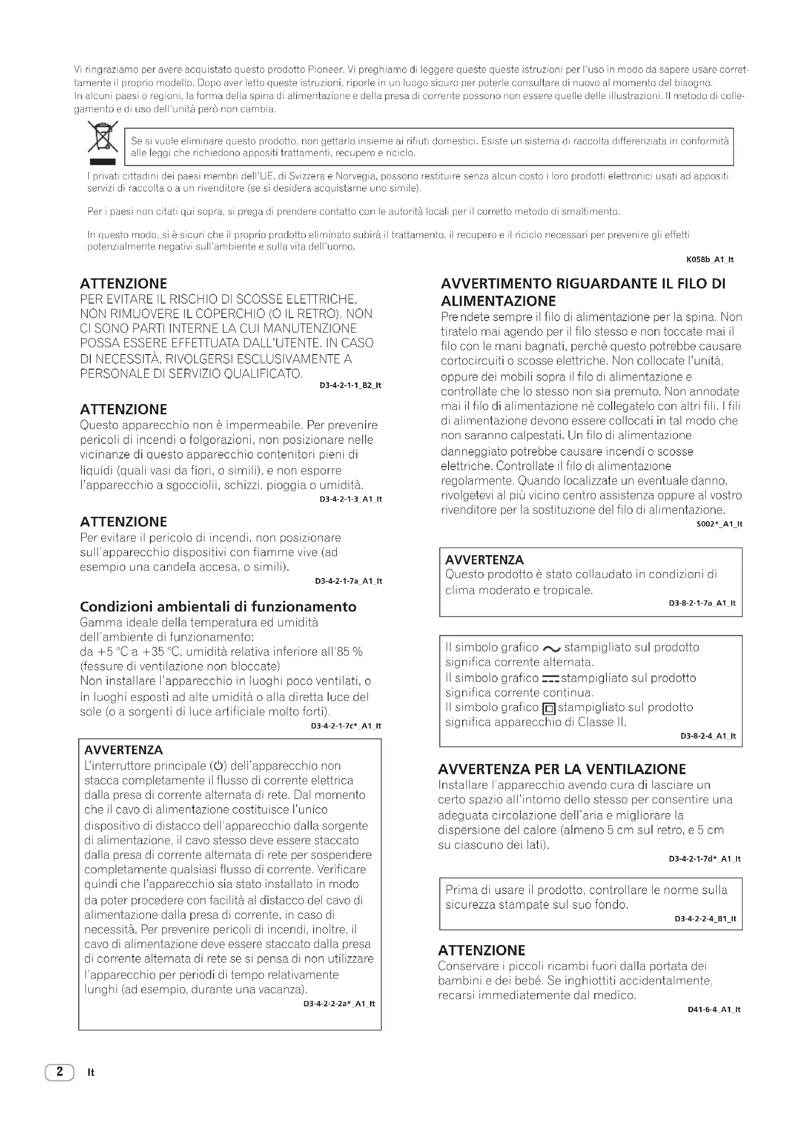 Vi ringraziamo per avere acquistato questo prodotto Pioneer. Vi preghiamo di leggere queste queste istruzioni per l’uso in modo da sapere usare corret- tamente il proprio modello. Dopo aver letto queste istruzioni, riporle in un luogo sicuro per poterle consultare di nuovo al momento del bisogno. In alcuni paesi o regioni, la forma della spina di alimentazione e della presa di corrente possono non essere quelle delle illustrazioni. Il metodo di colle- gamento e di uso dell’unità però non cambia. Se si vuole eliminare questo prodotto, non gettarlo insieme ai rifiuti domestici. Esiste un sistema di raccolta differenziata in conformità alle leggi che richiedono appositi trattamenti, recupero e riciclo. I privati cittadini dei paesi membri dell’UE, di Svizzera e Norvegia, possono restituire senza alcun costo i loro prodotti elettronici usati ad appositi servizi di raccolta o a un rivenditore (se si desidera acquistarne uno simile). Per i paesi non citati qui sopra, si prega di prendere contatto con le autorità locali per il corretto metodo di smaltimento. In questo modo, si è sicuri che il proprio prodotto eliminato subirà il trattamento, il recupero e il riciclo necessari per prevenire gli effetti potenzialmente negativi sull’ambiente e sulla vita dell’uomo. K058b_A1_It ATTENZIONE PER EVITARE IL RISCHIO DI SCOSSE ELETTRICHE, NON RIMUOVERE IL COPERCHIO (O IL RETRO). NON CI SONO PARTI INTERNE LA CUI MANUTENZIONE POSSA ESSERE EFFETTUATA DALL’UTENTE. IN CASO