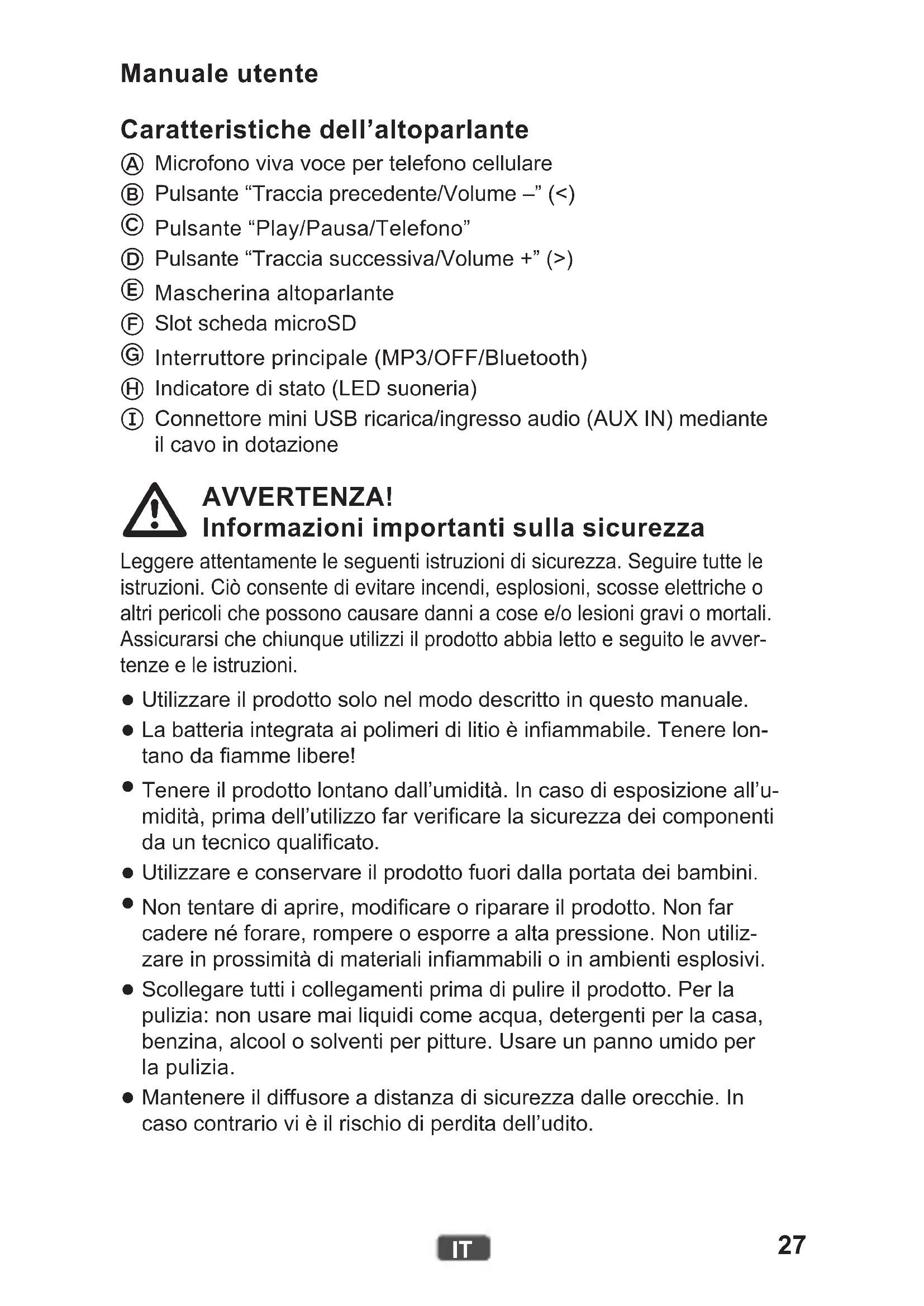 Connettore mini USB ricarica/ingresso audio (AUX IN) mediante il cavo in dotazione AVVERTENZA! Informazioni importanti sulla sicurezza Leggere attentamente le seguenti istruzioni di sicurezza. Seguire tutte le istruzioni. Ciò consente di evitare incendi, esplosioni, scosse elettriche o altri pericoli che possono causare danni a cose e/o lesioni gravi o mortali. Assicurarsi che chiunque utilizzi il prodotto abbia letto e seguito le avver- tenze e le istruzioni.