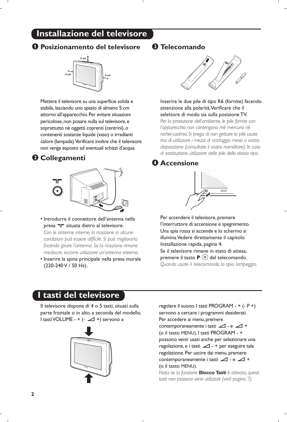 - Inserire la spina principale nella presa murale (220-240 V / 50 Hz). Inserire le due pile di tipo R6 (fornite) facendo attenzione alla polarità.Verificare che il selettore di modo sia sulla posizione TV. Per la protezione dell’ambiente, le pile fornite con l’apparecchio non contengono mè mercurio nè nichel-cadmio. Si prega di non gettare le pile usate ma di utilizzare i mezzi di riciclaggio messi a vostra disposizione (consultate il vostro rivenditore). In caso di sostituzione, utilizzare delle pile dello stesso tipo. ‘ Accensione Per accendere il televisore, premere l’interruttore di accensione e spegnimento. Una spia rossa si accende e lo schermo si illumina.Vedere direttamente il capitolo Installazione rapida, pagina 4. Se il televisore rimane in stato di attesa, premere il tasto P # del telecomando. Quando usate il telecomando, la spia lampeggia. I tasti del televisore Il televisore dispone di 4 o 5 tasti, situati sulla parte frontale o in alto, a seconda del modello. I tasti VOLUME - + (- ” +) servono a