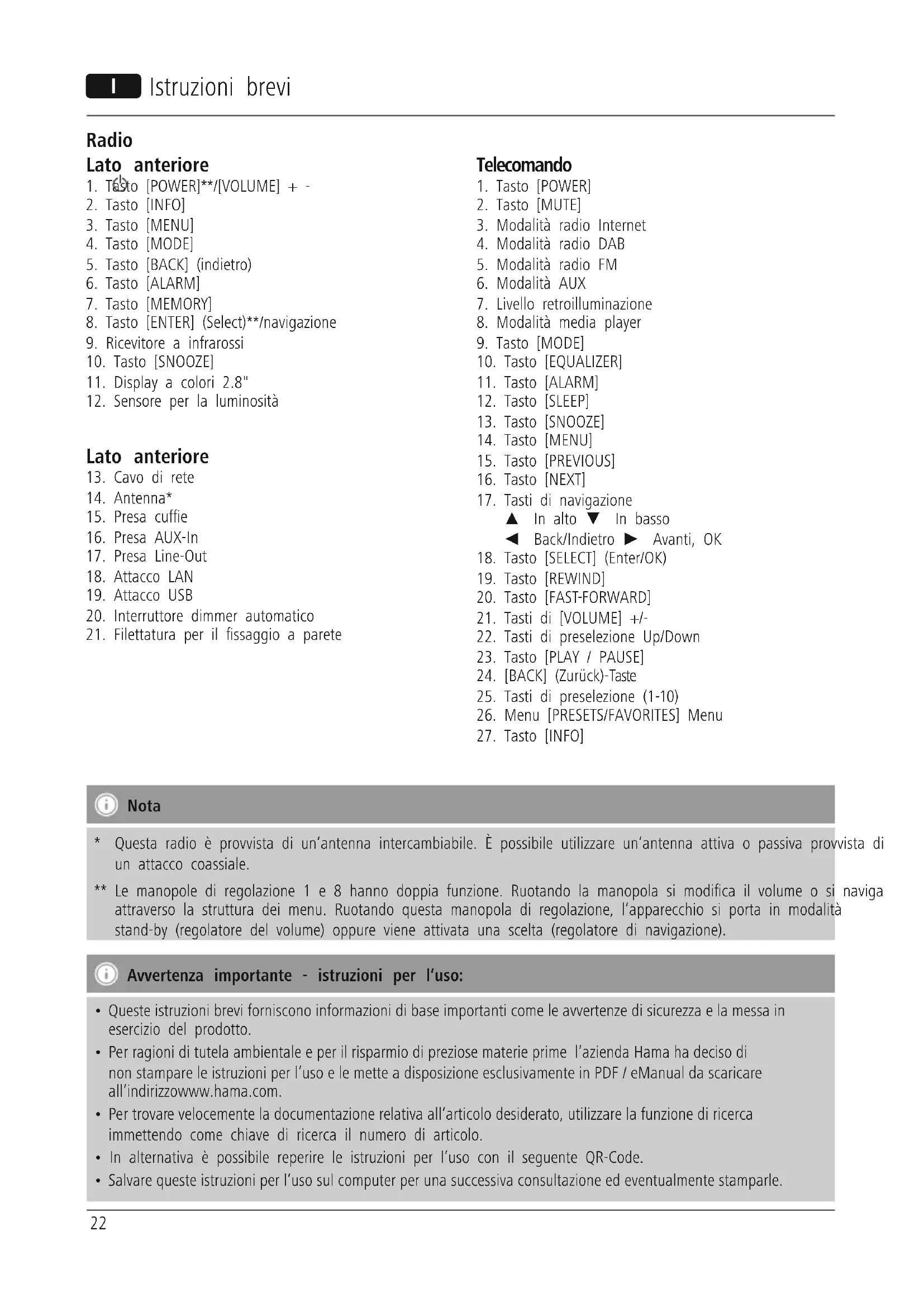 - Per ragioni di tutela ambientale e per il risparmio di preziose materie prime l’azienda Hama ha deciso di non stampare le istruzioni per l’uso e le mette a disposizione esclusivamente in PDF / eManual da scaricare all’indirizzowww.hama.com.