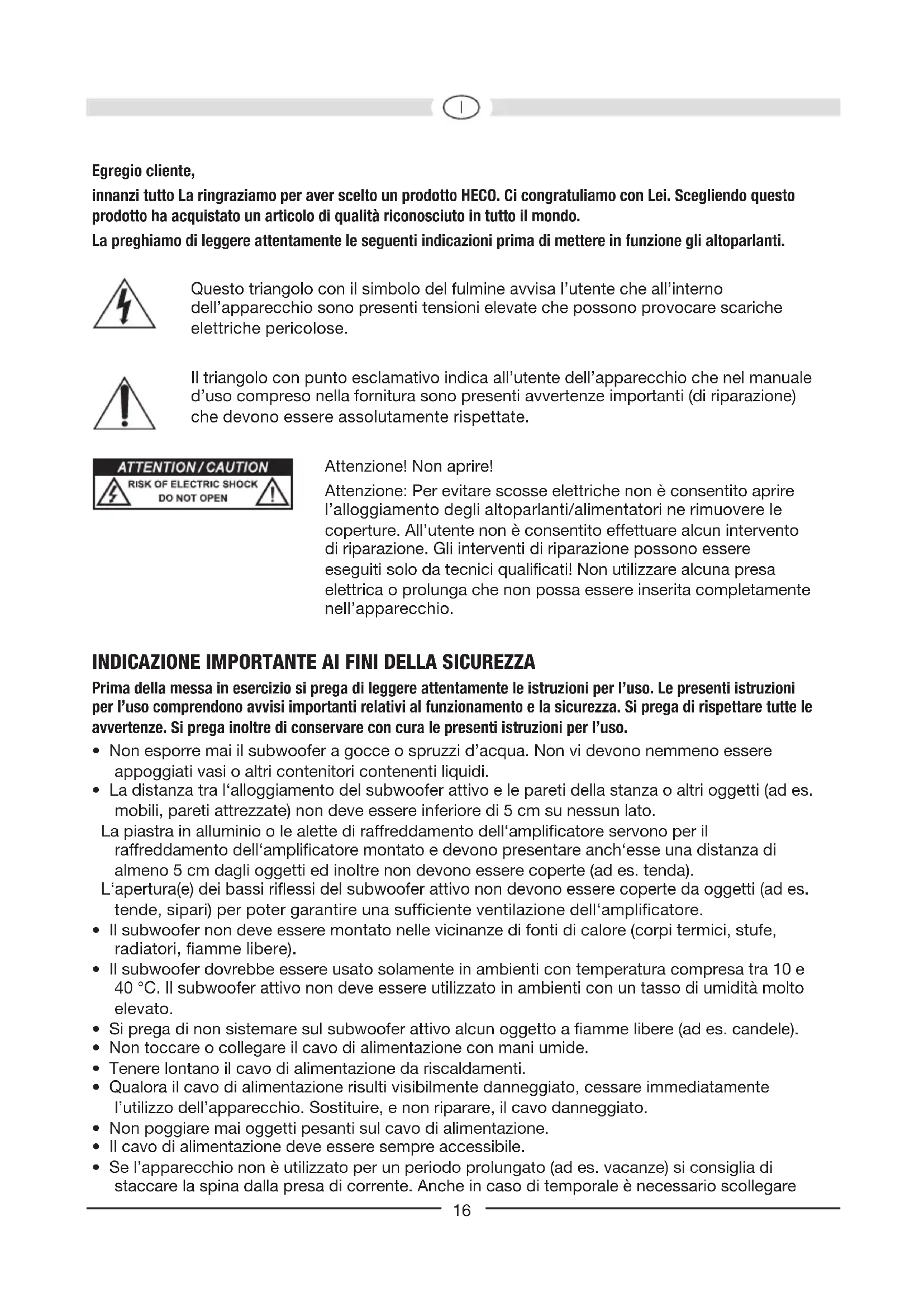 Egregio cliente, innanzi tutto La ringraziamo per aver scelto un prodotto HECO. Ci congratuliamo con Lei. Scegliendo questo prodotto ha acquistato un articolo di qualità riconosciuto in tutto il mondo. La preghiamo di leggere attentamente le seguenti indicazioni prima di mettere in funzione gli altoparlanti. Questo triangolo con il simbolo del fulmine avvisa l’utente che all’interno dell’apparecchio sono presenti tensioni elevate che possono provocare scariche elettriche pericolose. Il triangolo con punto esclamativo indica all’utente dell’apparecchio che nel manuale d’uso compreso nella fornitura sono presenti avvertenze importanti (di riparazione) che devono essere assolutamente rispettate. Attenzione! Non aprire! Attenzione: Per evitare scosse elettriche non è consentito aprire l’alloggiamento degli altoparlanti/alimentatori ne rimuovere le coperture. All’utente non è consentito effettuare alcun intervento di riparazione. Gli interventi di riparazione possono essere eseguiti solo da tecnici qualicati! Non utilizzare alcuna presa elettrica o prolunga che non possa essere inserita completamente nell’apparecchio.