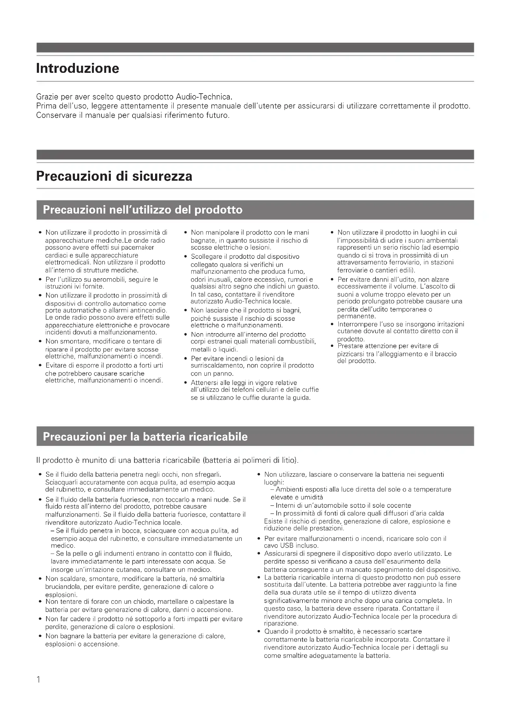 - Siri ist ein Markenzeichen von Apple Inc.1 Grazie per aver scelto questo prodotto Audio-Technica. Prima dell’uso, leggere attentamente il presente manuale dell’utente per assicurarsi di utilizzare correttamente il prodotto. Conservare il manuale per qualsiasi riferimento futuro. Introduzione Precauzioni nell’utilizzo del prodotto Precauzioni di sicurezza