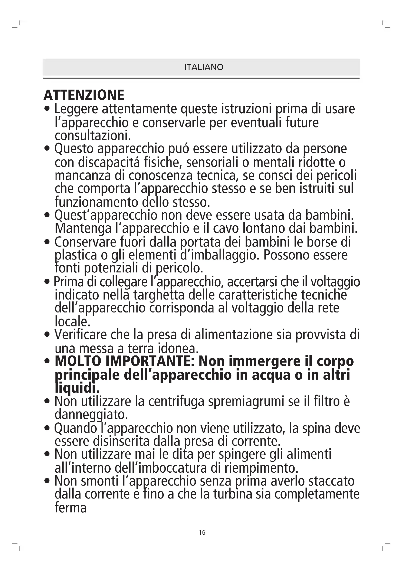 - MOLTO IMPORTANTE: Non immergere il corpo principale dell’apparecchio in acqua o in altri liquidi.