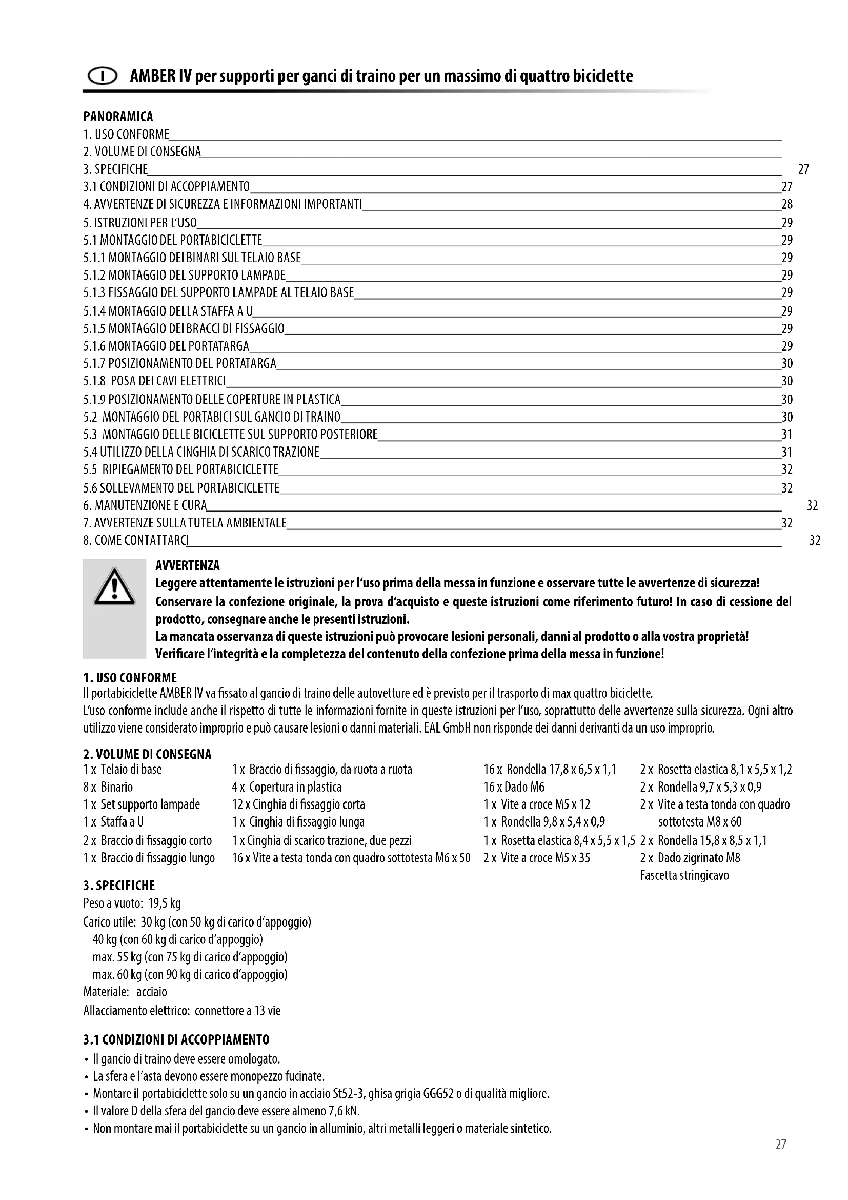 Il portabiciclette AMBER IV va ssato al gancio di traino delle autovetture ed è previsto per il trasporto di max quattro biciclette. L‘uso conforme include anche il rispetto di tutte le informazioni fornite in queste istruzioni per l’uso, soprattutto delle avvertenze sulla sicurezza. Ogni altro utilizzo viene considerato improprio e può causare lesioni o danni materiali. EAL GmbH non risponde dei danni derivanti da un uso improprio.