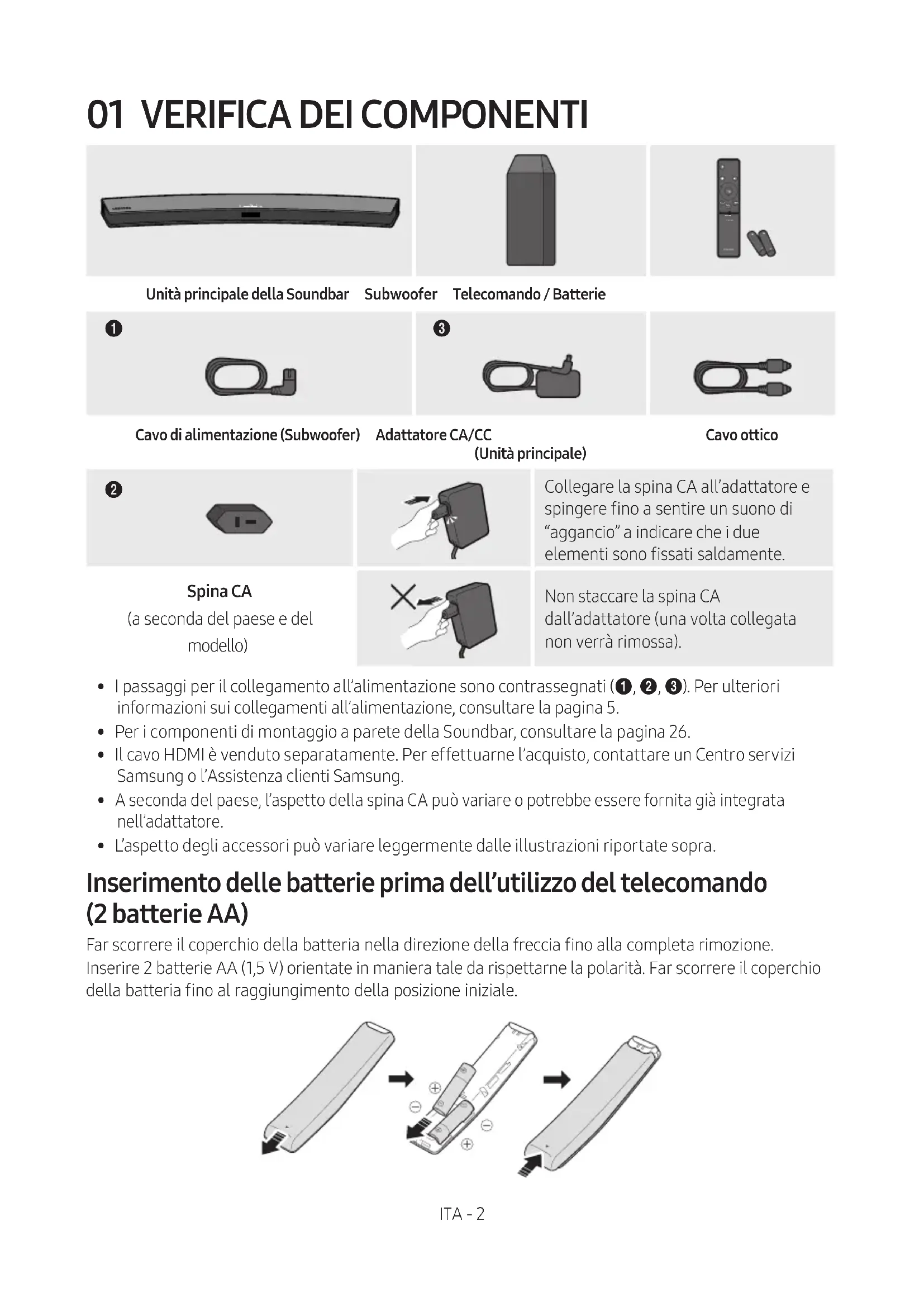 contengono sostanze chimiche dannose per l’ambiente. Non smaltirle con i comuni riuti domestici. Non gettare le batterie nel fuoco. Non cortocircuitare, smontare o surriscaldare le batterie. Una installazione scorretta delle batterie può causarne l’esplosione. Sostituire solo con batterie dello stesso tipo o equivalenti. INFORMAZIONI SUL MANUALE Il manuale utente è composto da due parti: il presente MANUALE UTENTE semplicato in formato cartaceo e un MANUALE COMPLETO dettagliato che è possibile scaricare. MANUALE UTENTE Consultare questo manuale per istruzioni di sicurezza, informazioni sull’installazione del prodotto, i componenti, i collegamenti e le speciche del prodotto. MANUALE COMPLETO È possibile accedere al centro assistenza clienti scansionando il codice QR. Per visualizzare il manuale sul proprio PC o dispositivo mobile, scaricarlo dal sito in formato documento. (http://www.samsung.com/support) Le caratteristiche e le speciche sono soggette a modiche senza preavviso.ITA - iv SOMMARIO 01 Vericadeicomponenti 2 Inserimento delle batterie prima dell’utilizzo del telecomando (2 batterie AA) ------------------------- 2 02 Panoramicadelprodotto 3 Pannello superiore / Pannello anteriore della Soundbar ------------------------- 3 Pannello inferiore della Soundbar ------------------------- 4 03 CollegamentodellaSoundbar 5 Collegamento alla rete elettrica
