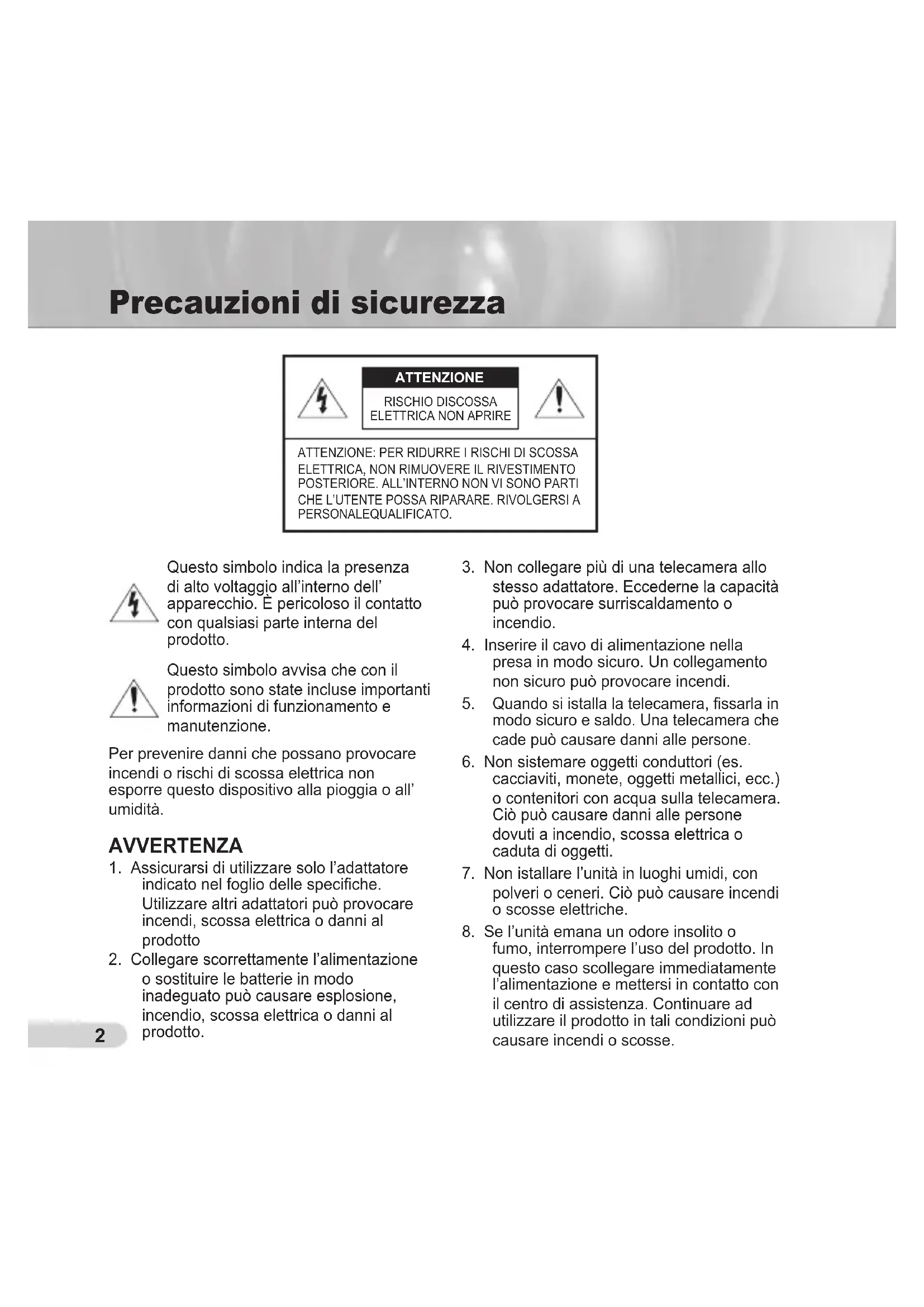 fumo, interrompere l’uso del prodotto. In questo caso scollegare immediatamente l’alimentazione e mettersi in contatto con il centro di assistenza. Continuare ad utilizzare il prodotto in tali condizioni può causare incendi o scosse. Precauzioni di sicurezza ATTENZIONE: PER RIDURRE I RISCHI DI SCOSSA ELETTRICA, NON RIMUOVERE IL RIVESTIMENTO POSTERIORE. ALL’INTERNO NON VI SONO PARTI CHE L’UTENTE POSSA RIPARARE. RIVOLGERSI A PERSONALEQUALIFICATO. ATTENZIONE