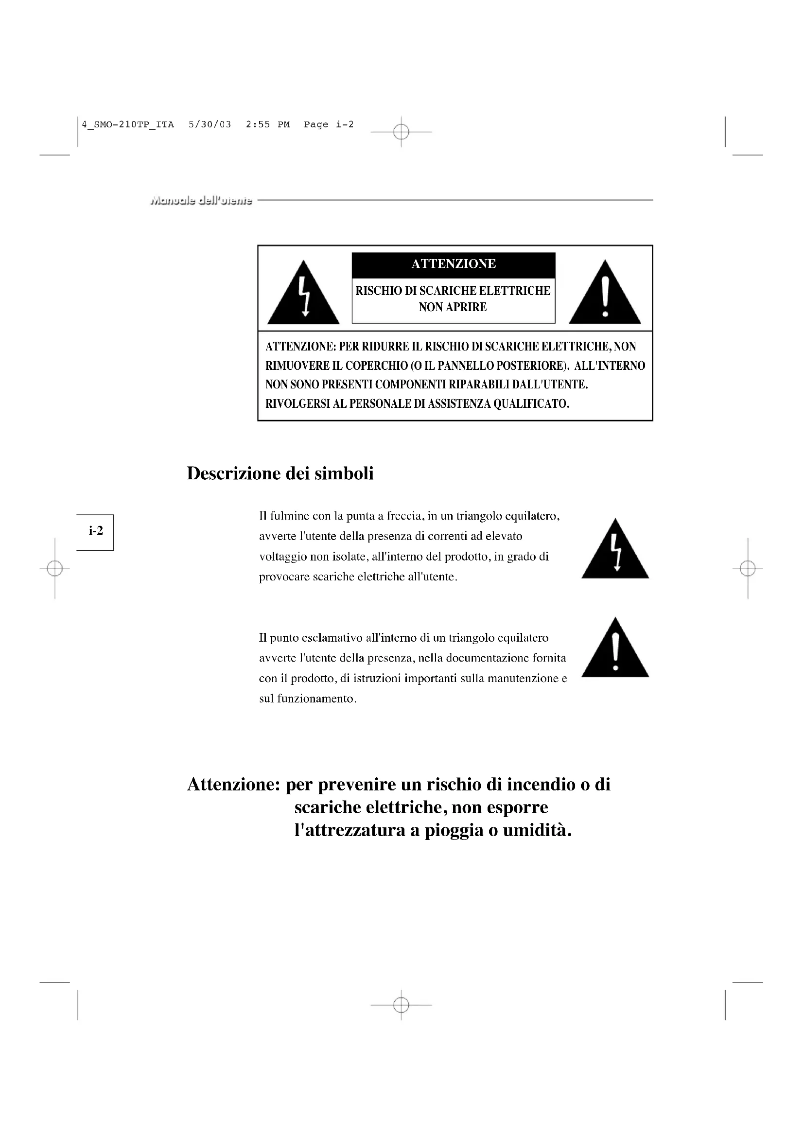 - Überprüfen Sie, ob im EINSTELL-Menü die Zeit für “SEQUENZ” richtig eingestellt ist. 3_SMO-210TP_GER 5/30/03 2:55 PM Page g-48g-49 Memo 3_SMO-210TP_GER 5/30/03 2:55 PM Page g-49i-2 Descrizione dei simboli Il fulmine con la punta a freccia, in un triangolo equilatero, avverte l'utente della presenza di correnti ad elevato voltaggio non isolate, all'interno del prodotto, in grado di provocare scariche elettriche all'utente. Il punto esclamativo all'interno di un triangolo equilatero avverte l'utente della presenza, nella documentazione fornita con il prodotto, di istruzioni importanti sulla manutenzione e sul funzionamento. Attenzione: per prevenire un rischio di incendio o di scariche elettriche, non esporre l'attrezzatura a pioggia o umidità. ATTENZIONE: PER RIDURRE IL RISCHIO DI SCARICHE ELETTRICHE, NON RIMUOVERE IL COPERCHIO (O IL PANNELLO POSTERIORE). ALL'INTERNO NON SONO PRESENTI COMPONENTI RIPARABILI DALL'UTENTE. RIVOLGERSI AL PERSONALE DI ASSISTENZA QUALIFICATO.