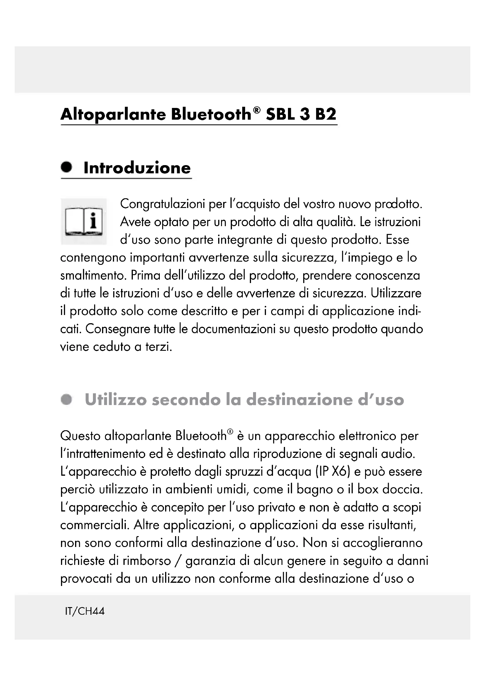 SBL 3 B2 Introduzione Congratulazioni per l‘acquisto del vostro nuovo pro dotto. Avete optato per un prodotto di alta qualità. Le istruzioni d‘uso sono parte integrante di questo prodotto. Esse contengono importanti avvertenze sulla sicurezza, l‘impiego e lo smaltimento. Prima dell‘utilizzo del prodotto, prendere conoscenza di tutte le istruzioni d‘uso e delle avvertenze di sicurezza. Utilizzare il prodotto solo come descritto e per i campi di applicazione indi- cati. Consegnare tutte le documentazioni su questo prodotto q uando viene ceduto a terzi. Utilizzo secondo la destinazione d’uso Questo altoparlante Bluetooth