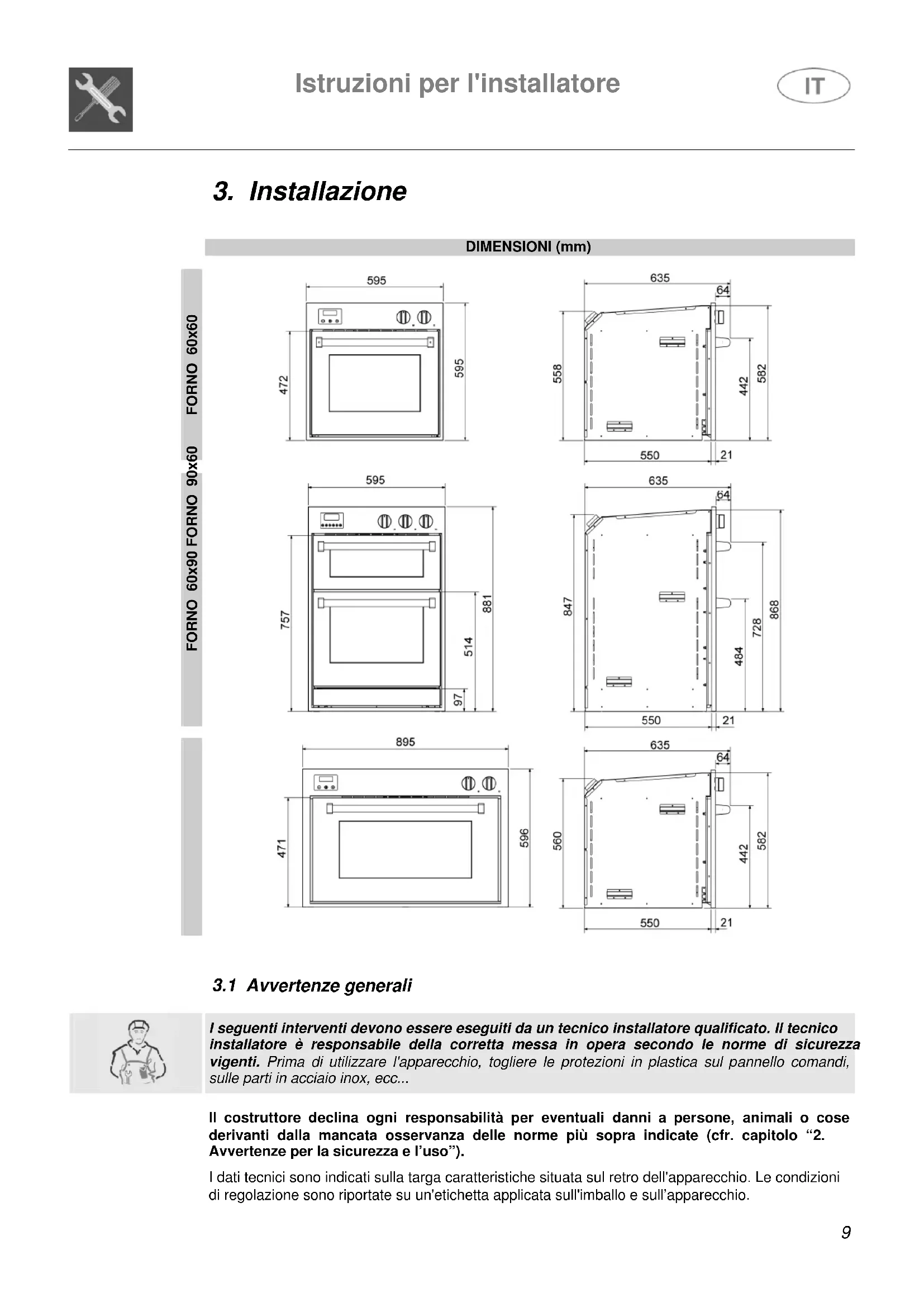 Il costruttore declina ogni responsabilità per eventuali danni a persone, animali o cose derivanti dalla mancata osservanza delle norme più sopra indicate (cfr. capitolo “2. Avvertenze per la sicurezza e l’uso”). I dati tecnici sono indicati sulla targa caratteristiche situata sul retro dell'apparecchio. Le condizioni di regolazione sono riportate su un'etichetta applicata sull'imballo e sull’apparecchio.Istruzioni per l'installatore