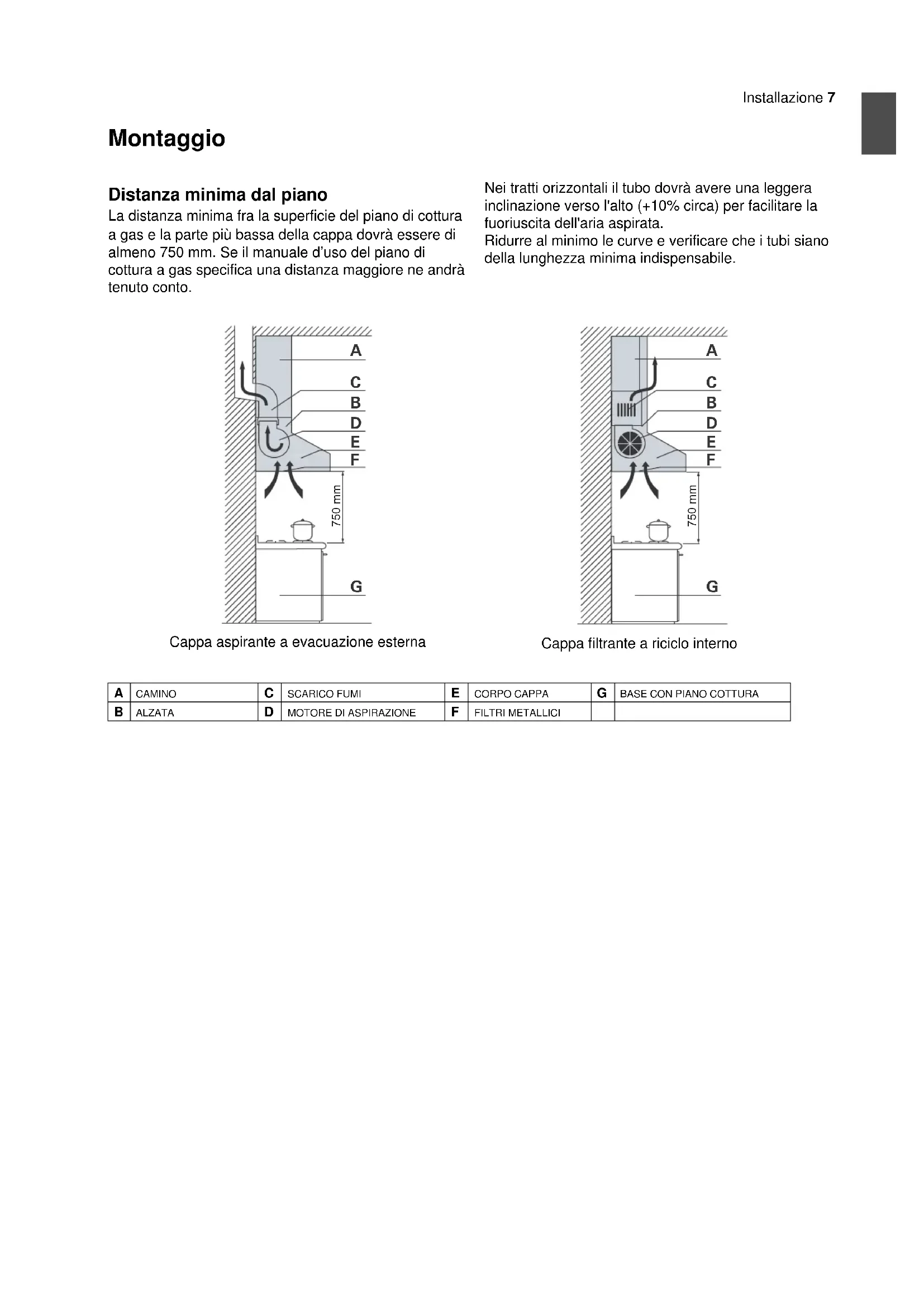 700 / 900 / 1000 / 1200 Tipo K Tipo GK Tipo AK Tipo AKLInstallazione 7 Montaggio Distanza minima dal piano La distanza minima fra la superficie del piano di cottura a gas e la parte più bassa della cappa dovrà essere di almeno 750 mm. Se il manuale d’uso del piano di cottura a gas specifica una distanza maggiore ne andrà tenuto conto. Nei tratti orizzontali il tubo dovrà avere una leggera inclinazione verso l'alto (+10% circa) per facilitare la fuoriuscita dell'aria aspirata. Ridurre al minimo le curve e verificare che i tubi siano della lunghezza minima indispensabile.