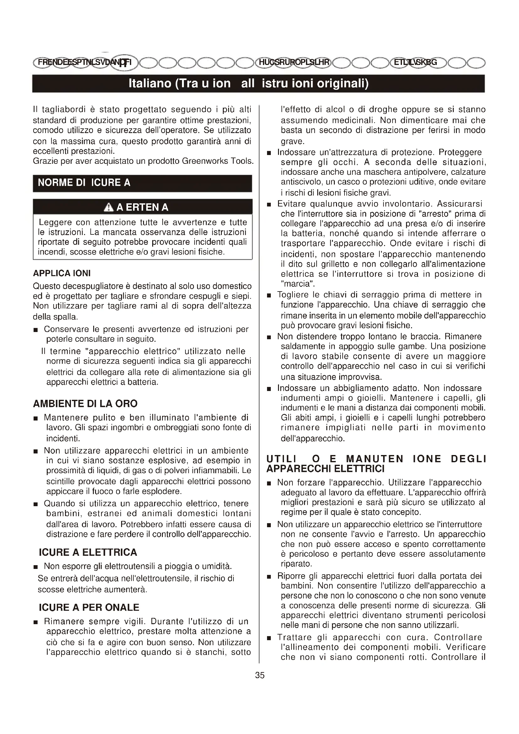 FR EN DE ES PT NL SV DA NO FI HU CS RU RO PL SL HR HU CS RU RO PL SL HR ET LT LV SK BG ET LT LV SK BG Il tagliabordi è stato progettato seguendo i più alti standard di produzione per garantire ottime prestazioni, comodo utilizzo e sicurezza dell’operatore. Se utilizzato con la massima cura, questo prodotto garantirà anni di eccellenti prestazioni. Grazie per aver acquistato un prodotto Greenworks Tools.