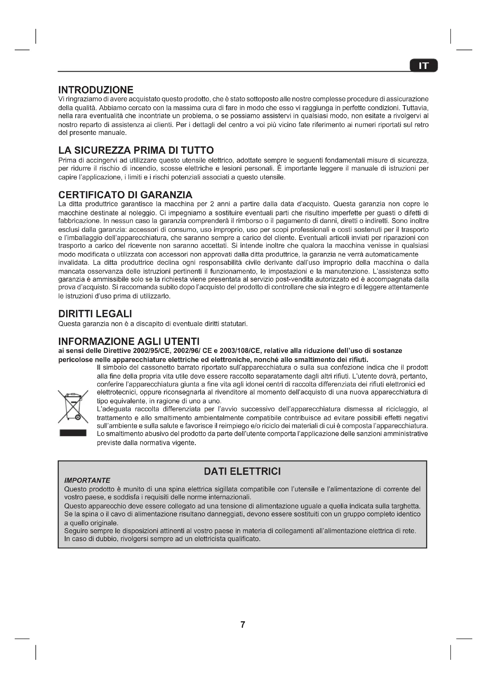 ai sensi delle Direttive 2002/95/CE, 2002/96/ CE e 2003/108/CE, relative alla riduzione dell’uso di sostanze pericolose nelle apparecchiature elettriche ed elettroniche, nonché allo smaltimento dei riuti. Il simbolo del cassonetto barrato riportato sull’apparecchiatura o sulla sua confezione indica che il prodott allanedellapropriavitautiledeveessereraccoltoseparatamentedaglialtririuti.L’utentedovrà,pertanto, conferirel’apparecchiaturagiuntaanevitaagliidoneicentridiraccoltadifferenziatadeiriutielettronicied elettrotecnici, oppure riconsegnarla al rivenditore al momento dell’acquisto di una nuova apparecchiatura di tipo equivalente, in ragione di uno a uno. L’adeguata raccolta differenziata per l’avvio successivo dell’apparecchiatura dismessa al riciclaggio, al trattamento e allo smaltimento ambientalmente compatibile contribuisce ad evitare possibili effetti negativi sull’ambiente e sulla salute e favorisce il reimpiego e/o riciclo dei materiali di cui è composta l’apparecchiatura. Lo smaltimento abusivo del prodotto da parte dell’utente comporta l’applicazione delle sanzioni amministrative previste dalla normativa vigente. DATI ELETTRICI IMPORTANTE Questo prodotto è munito di una spina elettrica sigillata compatibile con l’utensile e l’alimentazione di corrente del vostro paese, e soddisfa i requisiti delle norme internazionali. Questo apparecchio deve essere collegato ad una tensione di alimentazione uguale a quella indicata sulla targhetta. Se la spina o il cavo di alimentazione risultano danneggiati, devono essere sostituiti con un gruppo completo identico a quello originale. Seguire sempre le disposizioni attinenti al vostro paese in materia di collegamenti all’alimentazione elettrica di rete. In caso di dubbio, rivolgersi sempre ad un elettricista qualificato.IT
