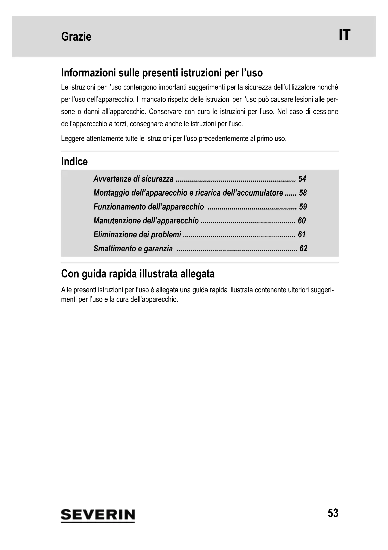 - Eliminación por separado del aparato y el acumulador eléctrico Los aparatos y los acumuladores eléctricos identificados con este símbolo deben eliminarse por separado de la basura doméstica. Los aparatos de los acumuladores eléctricos contienen materia prima valiosa que puede reutilizarse. Una eliminación de residuos correcta protege el medio ambiente y la salud de sus congéneres. En- tregue el aparato y el acumulador desmontado por separado a los puntos de reco- gida correspondientes para su eliminación. Garantía Las siguientes condiciones de garantía no afectan a los derechos de garantía legal frente al vende- dor y a otras posibles garantías del vendedor. Si resulta necesaria una reparación, póngase en contacto con nuestro servicio de atención al cliente por teléfono o por correo electrónico. Puede encontrar los datos de contacto en el anexo de este manual de instrucciones. En caso de garantía, también puede dirigirse directa- mente al distribuidor. Además, SEVERIN concede una garantía de fabricantes de dos años a par- tir de la fecha de la compra. Durante ese plazo de tiempo eliminaremos de forma gratuita cualquier deficiencia que pueda demostrarse que se debe a un fallo de material o de fabricación e impida un funcionamiento normal. Queda excluido cualquier otro derecho de reclamación. Quedan excluidos de la garantía: Los daños que se deban a la inobservancia del manual de ins- trucciones, la manipulación incorrecta o el desgaste normal, así como los referidos a piezas frágiles como cristal, plástico o LED. Quedan excluidos además de la garantía las baterías y los acumula- dores defectuosos a causa del desgaste normal o una manipulación incorrecta o cuya vida útil se haya acortado. La garantía se extingue en caso de intervención por parte de instancias no autorizadas por SEVERIN.53 Grazie 1Grazie Informazioni sulle presenti istruzioni per l’uso Le istruzioni per l’uso contengono importanti suggerimenti per la sicurezza dell’utilizzatore nonché per l’uso dell’apparecchio. Il mancato rispetto delle istruzioni per l’uso può causare lesioni alle per- sone o danni all’apparecchio. Conservare con cura le istruzioni per l’uso. Nel caso di cessione dell’apparecchio a terzi, consegnare anche le istruzioni per l’uso. Leggere attentamente tutte le istruzioni per l’uso precedentemente al primo uso. Indice Avvertenze di sicurezza p. 54