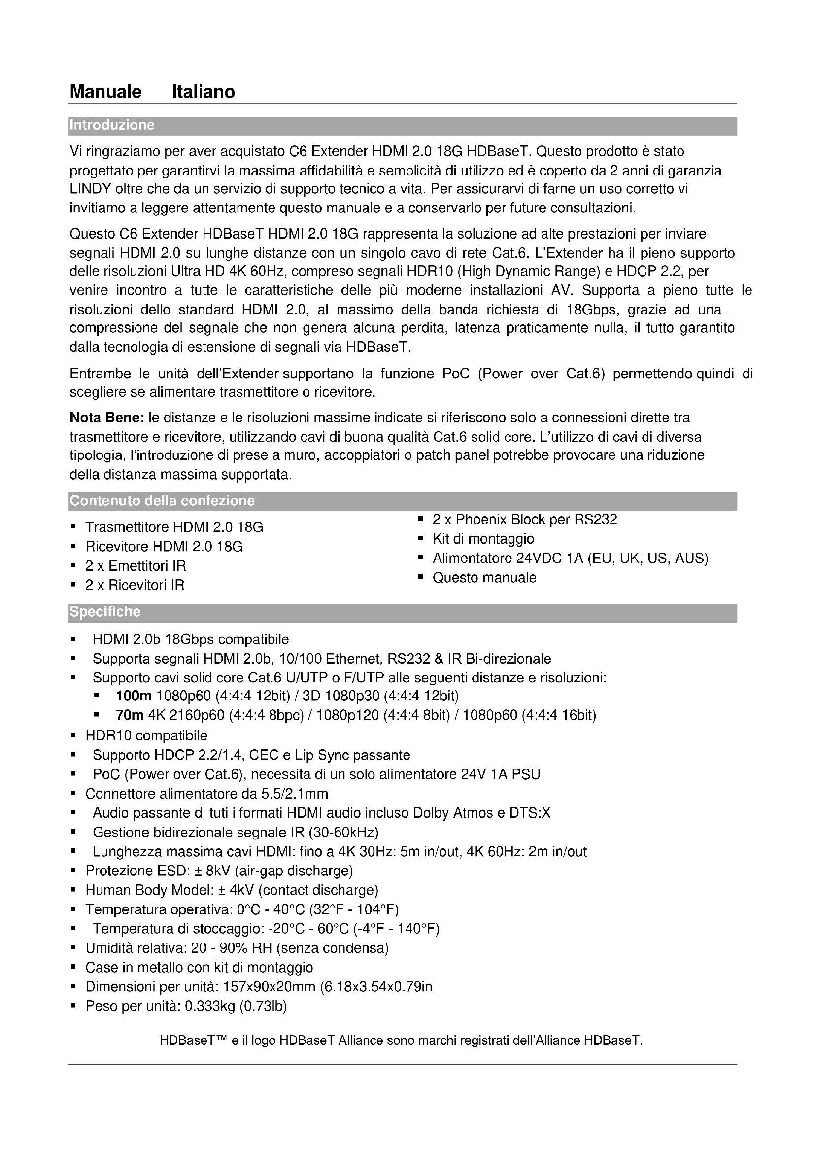 In aggiunta ai passaggi di base elencati qui sopra, l’Extender HDMI 2.0 18G può anche fornire le seguenti funzioni aggiuntive: Ethernet 10/100 Trasmettitore e ricevitore hanno una singola porta RJ45 per la connessione ad una rete o Router, Switch, IP Camera, Access Point Wireless o Smart TV. Seriale RS-232 Trasmettitore e ricevitore hanno un terminale seriale per l’estensione di segnali di controllo. Infrarossi Trasmettitore e ricevitore hanno porte IR In e Out, con due coppie di cavi IR. Questi cavi permettono di usare il telecomando di un dispositivo dal trasmettitore al ricevitore o vice versa. Risoluzione dei problemi Non c’è segnale video. Possono esserci differenze rilevanti in baste alla lunghezza/tipologia dei cavi utilizzati e anche ai differenti ingressi dei vari HDTV HDMI 2.0 4K 60Hz. Se riscontraste problemi, seguite i seguenti passaggi: Provate un ingresso diverso sulla vostra HDTV. Riducete la lunghezza dei cavi HDMI in ingresso e in uscita (massimo 1m). Provate con un cavo HDMI 1m differente. Controllate che il connettore dell’alimentatore sia inserito correttamente e che i LED power siano illuminati sia sul trasmettitore che sul ricevitore. Controllate che il cavo Cat.6/7 sia inserito correttamente e che i LED verdi sulla parte sinistra delle porte HDBaseT siano illuminati. Controllate che i LED gialli (Sync) sulla parte destra delle porte HDBaseT lampeggino, in caso contrario spegnete e riaccendete sorgente e monitor. Per alcuni dispositivi HDMI può essere utile scollegare e ricollegare il cavo HDMI per inizializzare di nuovo il riconoscimento e l’handshake HDMI. Spegnere tutti i dispositivi e riaccenderli nel seguente ordine: extender, monitor e sorgente. Ridurre la lunghezza del cavo Cat.6/7 e dei cavi HDMI usati, o usare cavi di qualità superiore.CE/FCC Statement