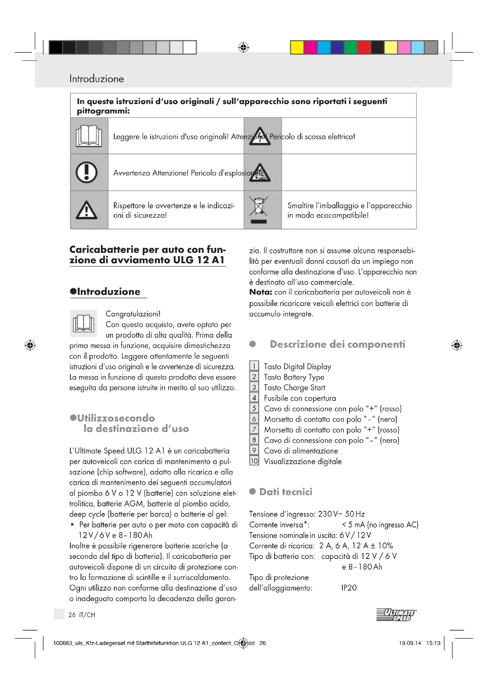 Scarica le istruzioni per il tuo Caricabatterie in formato PDF gratuitamente! Trova il tuo manuale ULG 12 A1 - ULTIMATE SPEED e riprendi in mano il tuo dispositivo elettronico. In questa pagina sono pubblicati tutti i documenti necessari per l'utilizzo del tuo dispositivo. ULG 12 A1 del marchio ULTIMATE SPEED.
