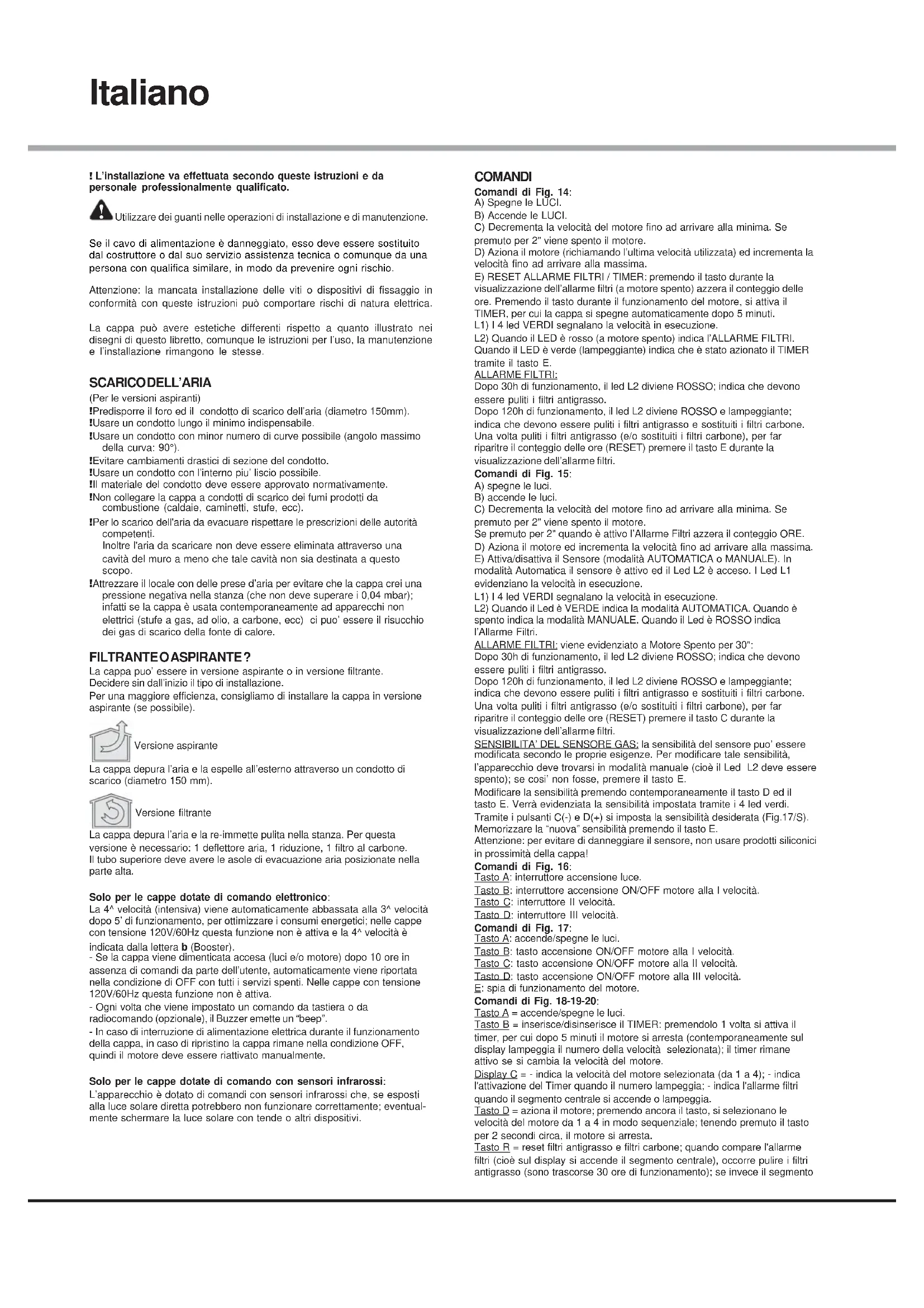 (Per le versioni aspiranti) ! Predisporre il foro ed il condotto di scarico dell’aria (diametro 150mm). ! Usare un condotto lungo il minimo indispensabile. ! Usare un condotto con minor numero di curve possibile (angolo massimo della curva: 90°). ! Evitare cambiamenti drastici di sezione del condotto. ! Usare un condotto con l’interno piu’ liscio possibile. ! Il materiale del condotto deve essere approvato normativamente. ! Non collegare la cappa a condotti di scarico dei fumi prodotti da combustione (caldaie, caminetti, stufe, ecc). ! Per lo scarico dell'aria da evacuare rispettare le prescrizioni delle autorità competenti. Inoltre l'aria da scaricare non deve essere eliminata attraverso una cavità del muro a meno che tale cavità non sia destinata a questo scopo. ! Attrezzare il locale con delle prese d’aria per evitare che la cappa crei una pressione negativa nella stanza (che non deve superare i 0,04 mbar); infatti se la cappa è usata contemporaneamente ad apparecchi non elettrici (stufe a gas, ad olio, a carbone, ecc) ci puo’ essere il risucchio dei gas di scarico della fonte di calore. FILTRANTE O ASPIRANTE ? La cappa puo’ essere in versione aspirante o in versione filtrante. Decidere sin dall’inizio il tipo di installazione. Per una maggiore efficienza, consigliamo di installare la cappa in versione aspirante (se possibile). Versione aspirante La cappa depura l’aria e la espelle all’esterno attraverso un condotto di scarico (diametro 150 mm). Versione filtrante La cappa depura l’aria e la re-immette pulita nella stanza. Per questa versione è necessario: 1 deflettore aria, 1 riduzione, 1 filtro al carbone. Il tubo superiore deve avere le asole di evacuazione aria posizionate nella parte alta. Solo per le cappe dotate di comando elettronico: La 4^ velocità (intensiva) viene automaticamente abbassata alla 3^ velocità dopo 5’ di funzionamento, per ottimizzare i consumi energetici; nelle cappe con tensione 120V/60Hz questa funzione non è attiva e la 4^ velocità è indicata dalla lettera b (Booster). - Se la cappa viene dimenticata accesa (luci e/o motore) dopo 10 ore in assenza di comandi da parte dell’utente, automaticamente viene riportata nella condizione di OFF con tutti i servizi spenti. Nelle cappe con tensione 120V/60Hz questa funzione non è attiva. - Ogni volta che viene impostato un comando da tastiera o da radiocomando (opzionale), il Buzzer emette un “beep”. - In caso di interruzione di alimentazione elettrica durante il funzionamento della cappa, in caso di ripristino la cappa rimane nella condizione OFF, quindi il motore deve essere riattivato manualmente. Solo per le cappe dotate di comando con sensori infrarossi: L’apparecchio è dotato di comandi con sensori infrarossi che, se esposti alla luce solare diretta potrebbero non funzionare correttamente; eventual- mente schermare la luce solare con tende o altri dispositivi. COMANDI Comandi di Fig. 14: A) Spegne le LUCI. B) Accende le LUCI. C) Decrementa la velocità del motore fino ad arrivare alla minima. Se premuto per 2" viene spento il motore. D) Aziona il motore (richiamando l’ultima velocità utilizzata) ed incrementa la velocità fino ad arrivare alla massima. E) RESET ALLARME FILTRI / TIMER: premendo il tasto durante la visualizzazione dell’allarme filtri (a motore spento) azzera il conteggio delle ore. Premendo il tasto durante il funzionamento del motore, si attiva il TIMER, per cui la cappa si spegne automaticamente dopo 5 minuti. L1) I 4 led VERDI segnalano la velocità in esecuzione. L2) Quando il LED è rosso (a motore spento) indica l’ALLARME FILTRI. Quando il LED è verde (lampeggiante) indica che è stato azionato il TIMER tramite il tasto E. ALLARME FILTRI: Dopo 30h di funzionamento, il led L2 diviene ROSSO; indica che devono essere puliti i filtri antigrasso. Dopo 120h di funzionamento, il led L2 diviene ROSSO e lampeggiante; indica che devono essere puliti i filtri antigrasso e sostituiti i filtri carbone. Una volta puliti i filtri antigrasso (e/o sostituiti i filtri carbone), per far riparitre il conteggio delle ore (RESET) premere il tasto E durante la visualizzazione dell’allarme filtri. Comandi di Fig. 15: A) spegne le luci. B) accende le luci. C) Decrementa la velocità del motore fino ad arrivare alla minima. Se premuto per 2" viene spento il motore. Se premuto per 2" quando è attivo l’Allarme Filtri azzera il conteggio ORE. D) Aziona il motore ed incrementa la velocità fino ad arrivare alla massima. E) Attiva/disattiva il Sensore (modalità AUTOMATICA o MANUALE). In modalità Automatica il sensore è attivo ed il Led L2 è acceso. I Led L1 evidenziano la velocità in esecuzione. L1) I 4 led VERDI segnalano la velocità in esecuzione. L2) Quando il Led è VERDE indica la modalità AUTOMATICA. Quando è spento indica la modalità MANUALE. Quando il Led è ROSSO indica l’Allarme Filtri. ALLARME FILTRI: viene evidenziato a Motore Spento per 30": Dopo 30h di funzionamento, il led L2 diviene ROSSO; indica che devono essere puliti i filtri antigrasso. Dopo 120h di funzionamento, il led L2 diviene ROSSO e lampeggiante; indica che devono essere puliti i filtri antigrasso e sostituiti i filtri carbone. Una volta puliti i filtri antigrasso (e/o sostituiti i filtri carbone), per far riparitre il conteggio delle ore (RESET) premere il tasto C durante la visualizzazione dell’allarme filtri. SENSIBILITA’ DEL SENSORE GAS: la sensibilità del sensore puo’ essere modificata secondo le proprie esigenze. Per modificare tale sensibilità, l’apparecchio deve trovarsi in modalità manuale (cioè il Led L2 deve essere spento); se cosi’ non fosse, premere il tasto E. Modificare la sensibilità premendo contemporaneamente il tasto D ed il tasto E. Verrà evidenziata la sensibilità impostata tramite i 4 led verdi. Tramite i pulsanti C(-) e D(+) si imposta la sensibilità desiderata (Fig.17/S). Memorizzare la “nuova” sensibilità premendo il tasto E. Attenz