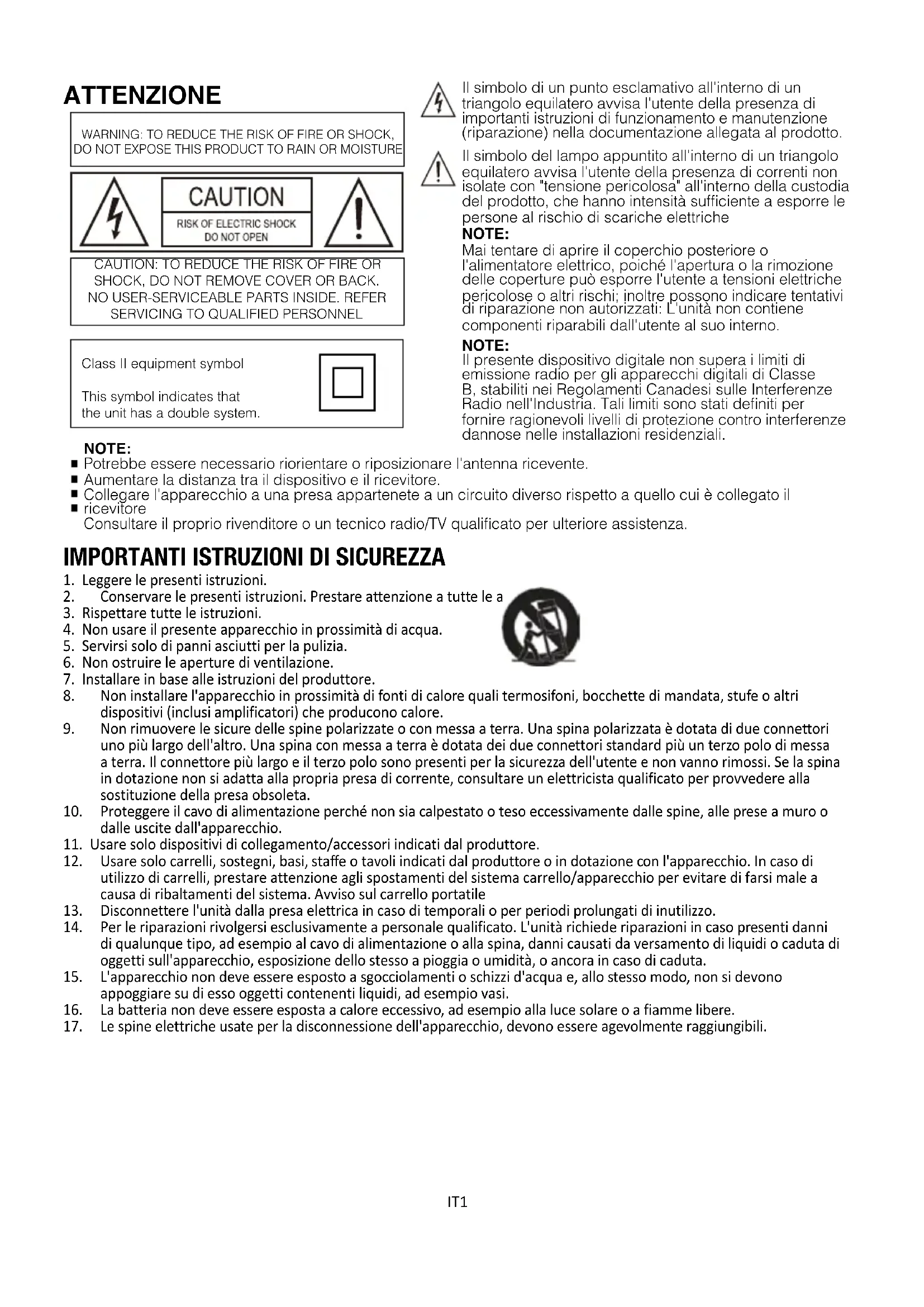 IMPORTANT ISTRUZIONI DI SICUREZZA