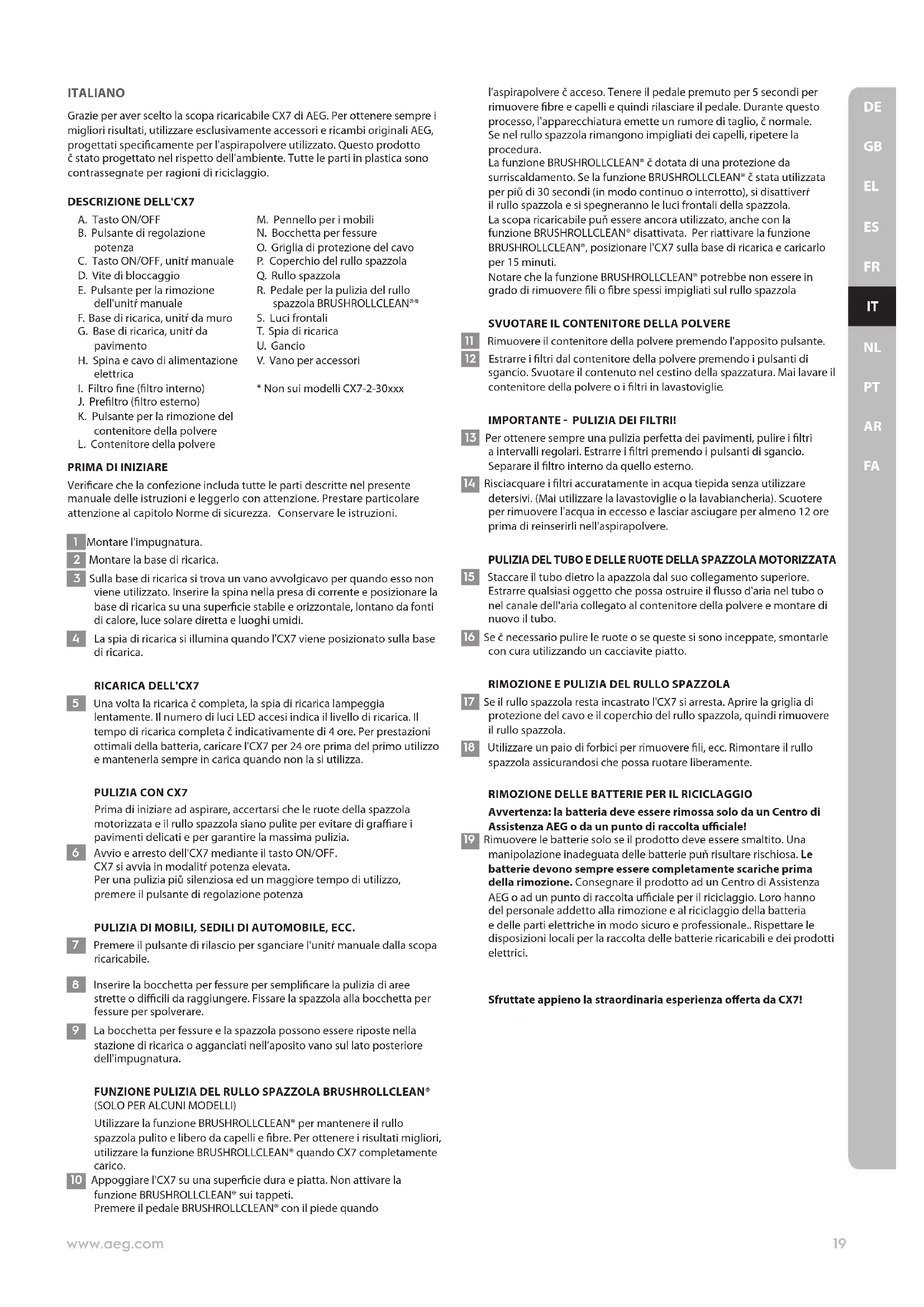 Avvertenza: la batteria deve essere rimossa solo da un Centro di Assistenza AEG o da un punto di raccolta uciale! 19 Rimuovere le batterie solo se il prodotto deve essere smaltito. Una manipolazione inadeguata delle batterie puň risultare rischiosa. Le batterie devono sempre essere completamente scariche prima della rimozione. Consegnare il prodotto ad un Centro di Assistenza AEG o ad un punto di raccolta uciale per il riciclaggio. Loro hanno del personale addetto alla rimozione e al riciclaggio della batteria e delle parti elettriche in modo sicuro e professionale.. Rispettare le disposizioni locali per la raccolta delle batterie ricaricabili e dei prodotti elettrici. Sfruttate appieno la straordinaria esperienza oerta da CX7! 19www.aeg.com