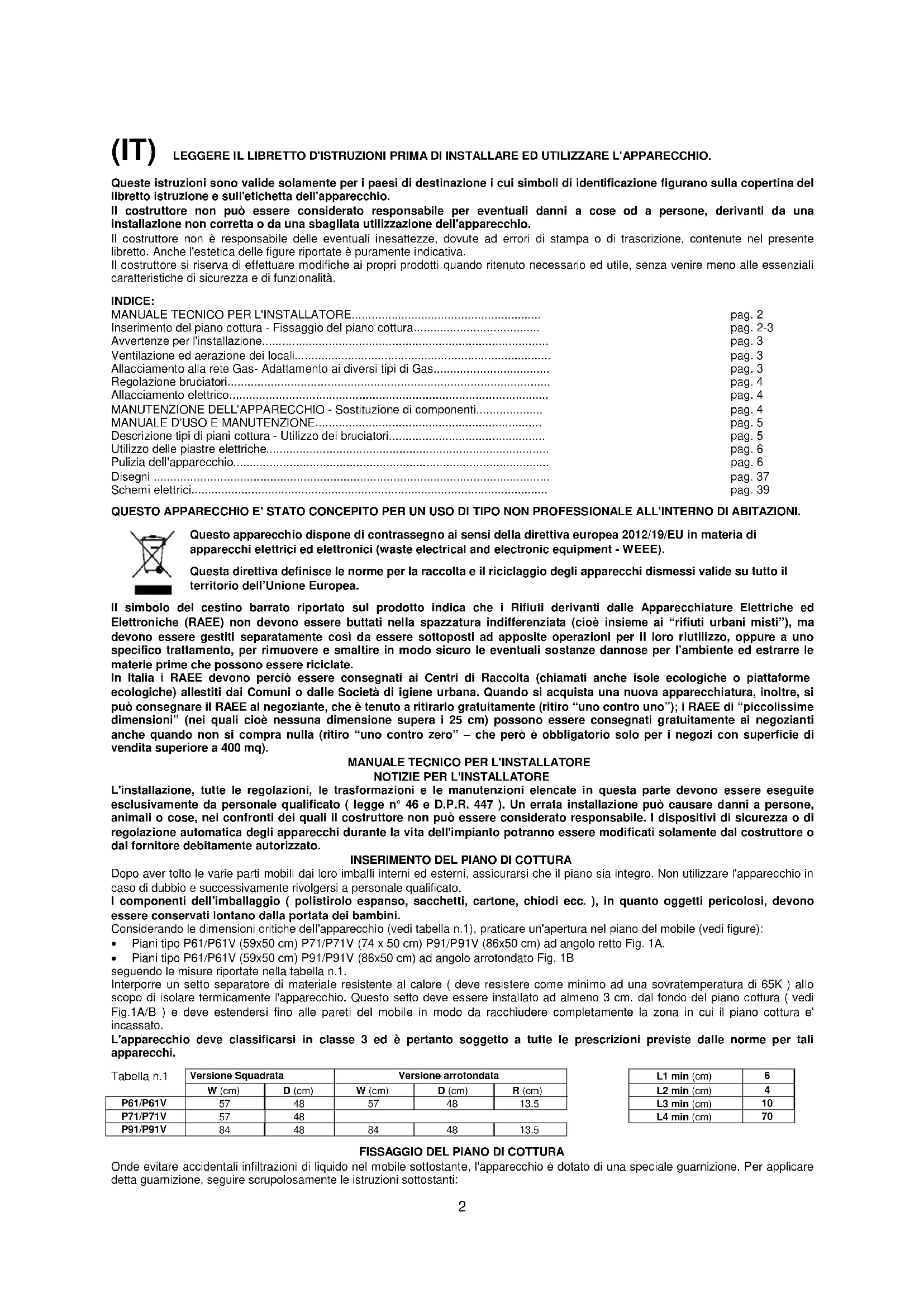 | Inserimento del piano cottura - Fissaggio del piano cottura. | pag. 2-3 |