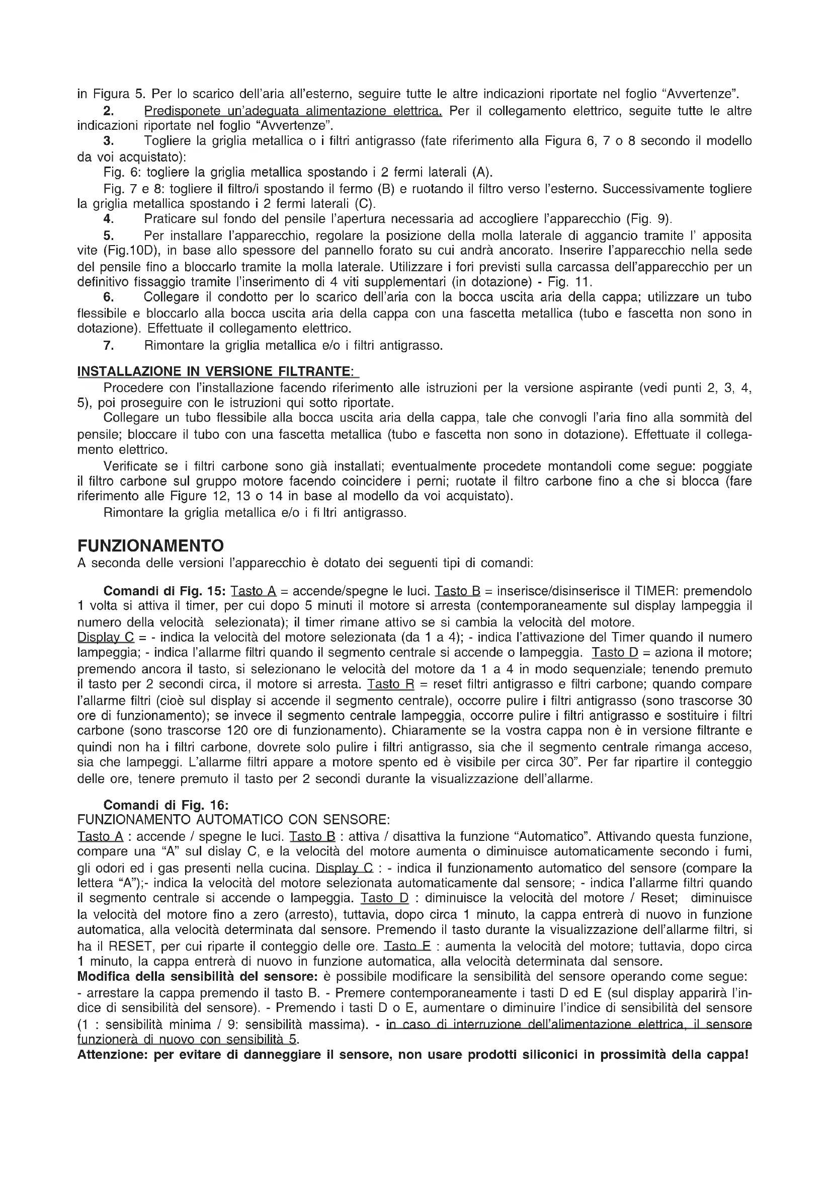 INSTALLAZIONE IN VERSIONE FILTRANTE: Procedere con l’installazione facendo riferimento alle istruzioni per la versione aspirante (vedi punti 2, 3, 4, 5), poi proseguire con le istruzioni qui sotto riportate. Collegare un tubo fl essibile alla bocca uscita aria della cappa, tale che convogli l’aria fi no alla sommità del pensile; bloccare il tubo con una fascetta metallica (tubo e fascetta non sono in dotazione). Effettuate il collega- mento elettrico. Verifi cate se i fi ltri carbone sono già installati; eventualmente procedete montandoli come segue: poggiate il fi ltro carbone sul gruppo motore facendo coincidere i perni; ruotate il fi ltro carbone fi no a che si blocca (fare riferimento alle Figure 12, 13 o 14 in base al modello da voi acquistato). Rimontare la griglia metallica e/o i fi ltri antigrasso. FUNZIONAMENTO A seconda delle versioni l’apparecchio è dotato dei seguenti tipi di comandi: Comandi di Fig. 15: Tasto A = accende/spegne le luci. Tasto B = inserisce/disinserisce il TIMER: premendolo 1 volta si attiva il timer, per cui dopo 5 minuti il motore si arresta (contemporaneamente sul display lampeggia il numero della velocità selezionata); il timer rimane attivo se si cambia la velocità del motore. Display C = - indica la velocità del motore selezionata (da 1 a 4); - indica l’attivazione del Timer quando il numero lampeggia; - indica l’allarme fi ltri quando il segmento centrale si accende o lampeggia. Tasto D = aziona il motore; premendo ancora il tasto, si selezionano le velocità del motore da 1 a 4 in modo sequenziale; tenendo premuto il tasto per 2 secondi circa, il motore si arresta. Tasto R = reset fi ltri antigrasso e fi ltri carbone; quando compare l’allarme fi ltri (cioè sul display si accende il segmento centrale), occorre pulire i fi ltri antigrasso (sono trascorse 30 ore di funzionamento); se invece il segmento centrale lampeggia, occorre pulire i fi ltri antigrasso e sostituire i fi ltri carbone (sono trascorse 120 ore di funzionamento). Chiaramente se la vostra cappa non è in versione fi ltrante e quindi non ha i fi ltri carbone, dovrete solo pulire i fi ltri antigrasso, sia che il segmento centrale rimanga acceso, sia che lampeggi. L’allarme fi ltri appare a motore spento ed è visibile per circa 30”. Per far ripartire il conteggio delle ore, tenere premuto il tasto per 2 secondi durante la visualizzazione dell’allarme. Comandi di Fig. 16: FUNZIONAMENTO AUTOMATICO CON SENSORE: Tasto A : accende / spegne le luci. Tasto B : attiva / disattiva la funzione “Automatico”. Attivando questa funzione, compare una “A” sul dislay C, e la velocità del motore aumenta o diminuisce automaticamente secondo i fumi, gli odori ed i gas presenti nella cucina. Display C : - indica il funzionamento automatico del sensore (compare la lettera “A”);- indica la velocità del motore selezionata automaticamente dal sensore; - indica l’allarme fi ltri quando il segmento centrale si accende o lampeggia. Tasto D : diminuisce la velocità del motore / Reset; diminuisce la velocità del motore fi no a zero (arresto), tuttavia, dopo circa 1 minuto, la cappa entrerà di nuovo in funzione automatica, alla velocità determinata dal sensore. Premendo il tasto durante la visualizzazione dell’allarme fi ltri, si ha il RESET, per cui riparte il conteggio delle ore. Tasto E : aumenta la velocità del motore; tuttavia, dopo circa 1 minuto, la cappa entrerà di nuovo in funzione automatica, alla velocità determinata dal sensore. Modifi ca della sensibilità del sensore: è possibile modifi care la sensibilità del sensore operando come segue: - arrestare la cappa premendo il tasto B. - Premere contemporaneamente i tasti D ed E (sul display apparirà l’in- dice di sensibilità del sensore). - Premendo i tasti D o E, aumentare o diminuire l’indice di sensibilità del sensore (1 : sensibilità minima / 9: sensibilità massima). - in caso di interruzione dell’alimentazione elettrica, il sensore funzionerà di nuovo con sensibilità 5. Attenzione: per evitare di danneggiare il sensore, non usare prodotti siliconici in prossimità della cappa!Comandi di Fig. 17: Interruttore A: LUCE; posizione 0: luce spenta; posizione 1: luce accesa. Interruttore B : VELOCITÀ MOTORE; permette la regolazione delle velocità di esercizio del motore; posizione 0: motore fermo. C : Spia di funzionamento del motore. Comandi di Fig.18: Tasto A: accende/spegne le luci; ogni 30 ore di funzionamento la spia luminosa corri- spondente (S) si accende e sta ad indicare che occorre pulire i fi ltri antigrasso; ogni 120 ore di funzionamento la spia luminosa corrispondente (S) lampeggia e sta ad indicare che occorre pulire i fi ltri antigrasso e sostituire il fi ltro al carbone. Per far ripartire il conteggio delle ore (RESET), tenere premuto il tasto A per circa 1” (mentre la spia S è in funzione). Tasto B: aziona il motore alla 1ª velocità (si accende la corrispondente spia luminosa); tenendolo premuto per circa 1” spegne il motore; premendo il tasto una seconda volta (mentre la spia luminosa è accesa) viene attivato il TIMER per cui dopo 5’ il motore si arresta (la spia luminosa lampeggia). Tasto C: azio- na il motore alla 2ª velocità (si accende la corrispondente spia luminosa); premendo il tasto una seconda volta (mentre la spia luminosa è accesa) viene attivato il TIMER per cui dopo 5’ il motore si arresta (la spia luminosa lampeggia). Tasto D: aziona il motore alla 3ª velocità (si accende la corrispondente spia luminosa); premendo il tasto una seconda volta (mentre la spia luminosa è accesa) viene attivato il TIMER per cui dopo 5’ il motore si arresta (la spia luminosa lampeggia). Tasto E: aziona il motore alla 4ª velocità (si accende la corrispondente spia luminosa); premendo il tasto una seconda volta (mentre la spia luminosa è accesa) viene attivato il TIMER per cui dopo 5’ il motore si arresta (la spia luminosa lampeggia). Una cura particolare va rivolta 