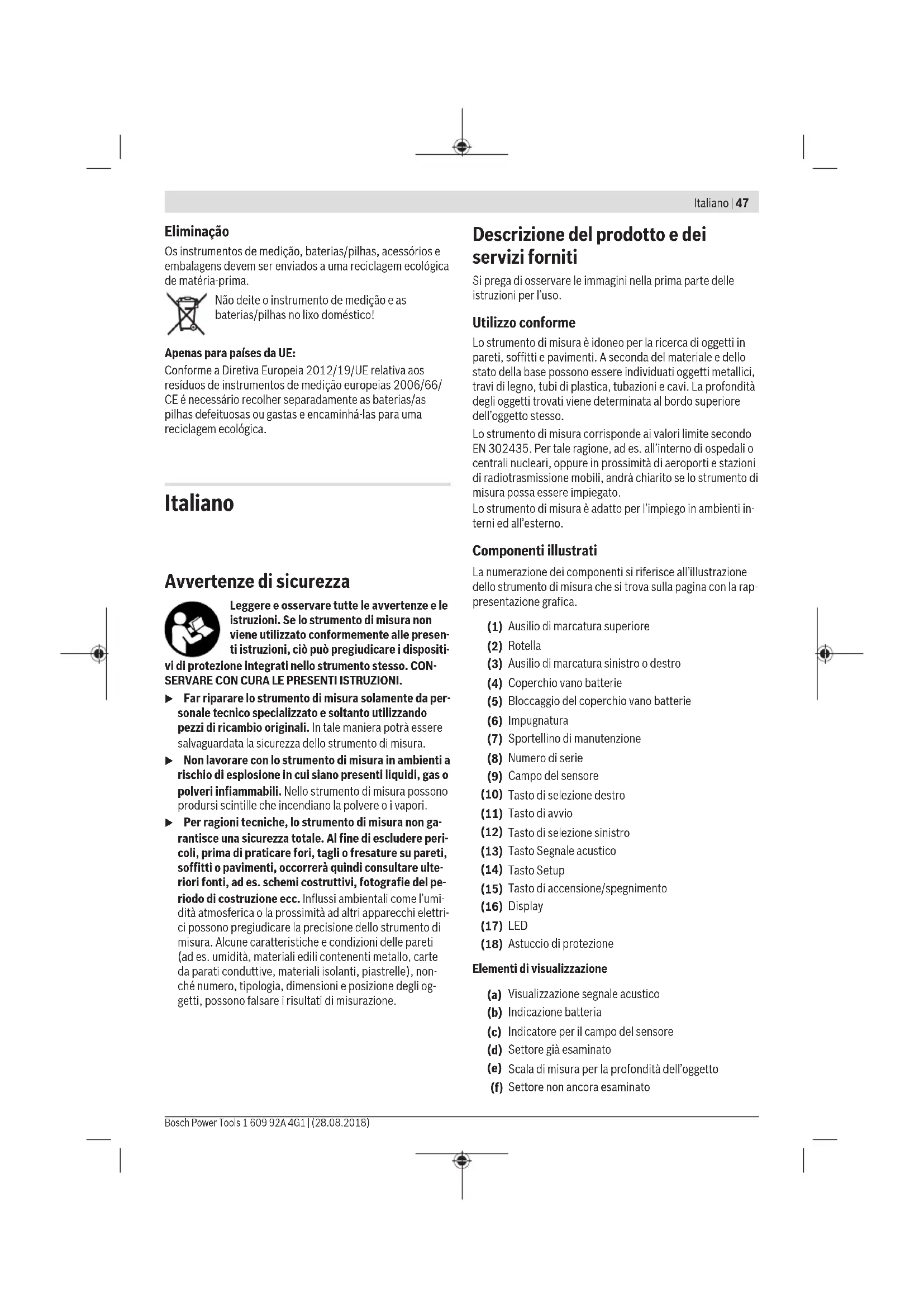 B) In base a dimensioni e tipologia dell’oggetto, nonché al materia- le ed allo stato del fondo sottostante C) Presenza esclusivamente di contaminazioni non conduttive, ma che, in alcune occasioni, possono essere rese temporaneamen- te conduttive dalla condensa. Per un’identificazione univoca dello strumento di misura, consultare il numero di serie (8) riportato sulla targhetta identificativa. u Un fondo dalle caratteristiche sfavorevoli può com- promettere la precisione e la profondità di localizza- zione del risultato di misurazione. Per il test del ricevitore, che verifica l’influsso di un segnale di disturbo sullo strumento di misura, vengono utilizzati il cri- terio ed il livello di efficienza definiti nella specifica ETSITS103361 (V1.1.1), capitolo 9.4.1, con una profon- dità dell’oggetto d = 60mm. Per il test di resistenza ai disturbi, viene utilizzato il seguente criterio di efficienza: In determinate condizioni (ad es. scarica elettrostatica o esposizione a campi elettromagnetici) i risultati di misurazio- ne possono essere alterati, i risultati di misurazione attuali possono andare persi e può essere necessario ripristinare lo strumento di misura, rimuovendo e reintroducendo le pile. Montaggio Introduzione/sostituzione delle pile Per il funzionamento dello strumento di misura, si consiglia di utilizzare pile alcaline al manganese, oppure batterie. Per aprire il coperchio del vano batterie(4), premere sul bloccaggio (5) nella direzione della freccia e prelevare il co- perchio del vano batterie. Introdurre le pile o le batterie. Pre- stare attenzione alla corretta polarità, come da schema nel vano batterie. L’indicatore batteria(b), nella riga di stato in alto sul display (16), indica il livello di carica delle pile o delle batterie. Avvertenza: Prestare attenzione alle variazioni nel simbolo della batteria, in modo da sostituire per tempo le pile o le batterie. Prego sostituire batterie Se sul display(16) comparirà l’avviso <Prego sostituire batterie>, le impostazioni verranno memorizzate e lo strumento di misura si spe- gnerà automaticamente. Intale caso, non sarà più possibile eseguire misurazioni. Le pi- le/le batterie andranno sostituite. Per estrarre le pile o le batterie, premere sull’estremità po- steriore di una pila o di una batteria, come indicato nello schema del coperchio vano batterie (1.). L’estremità ante- riore della pila/della batteria si disimpegnerà dal vano batte- rie (2.), consentendo di prelevare agevolmente la pila o la batteria stessa. Sostituire sempre contemporaneamente tutte le pile, o tutte le batterie. Utilizzare esclusivamente pile o batterie dello stesso produttore e della stessa capacità. u Se lo strumento di misura non viene impiegato per lun- ghi periodi, prelevare le pile o le batterie dallo stru- mento stesso. In caso di lunghi periodi di magazzinaggio, le pile e le batterie possono subire corrosioni e scaricarsi. Utilizzo u Proteggere lo strumento di misura da liquidi e dall’esposizione diretta ai raggi solari. u Non esporre lo strumento di misura a temperature o ad oscillazioni termiche estreme. In caso di forti oscil- lazioni di temperatura, lasciare che lo strumento di misura raggiunga la normale temperatura prima di ac- cenderlo. Temperature oppure sbalzi di temperatura estremi possono pregiudicare la precisione dello stru- mento di misura e la visualizzazione sul display. u Non applicare targhette adesive, né di altro genere, nel campo del sensore(9) sul retro dello strumento di misura. In particolare, le targhette in metallo influiscono sui risultati di misurazione. u L’impiego o l’esercizio nelle immediate vicinanze d’im- pianti di trasmissione, quali ad es. WLAN, UMTS, radar aeronautici, torri di trasmissione o microonde, può in- fluire sulla funzione di misurazione. u A causa del principio di funzionamento, alcuni influssi ambientali possono pregiudicare i risultati di misura- zione. Tali influssi si presentano ad es. in prossimità di apparecchi che generino forti campi elettrici, magne- tici o elettromagnetici, in presenza di umidità, in caso di materiali da costruzione contenenti metalli, di ma- teriali isolanti rivestiti in alluminio e di carte da parati o piastrelle conduttive. Per tale ragione, prima di prati- care fori, intagli o fresature in pareti, soffitti o pavimenti, consultare ulteriori fonti (ad es. schemi costruttivi). Funzionamento (vedere Fig. B)