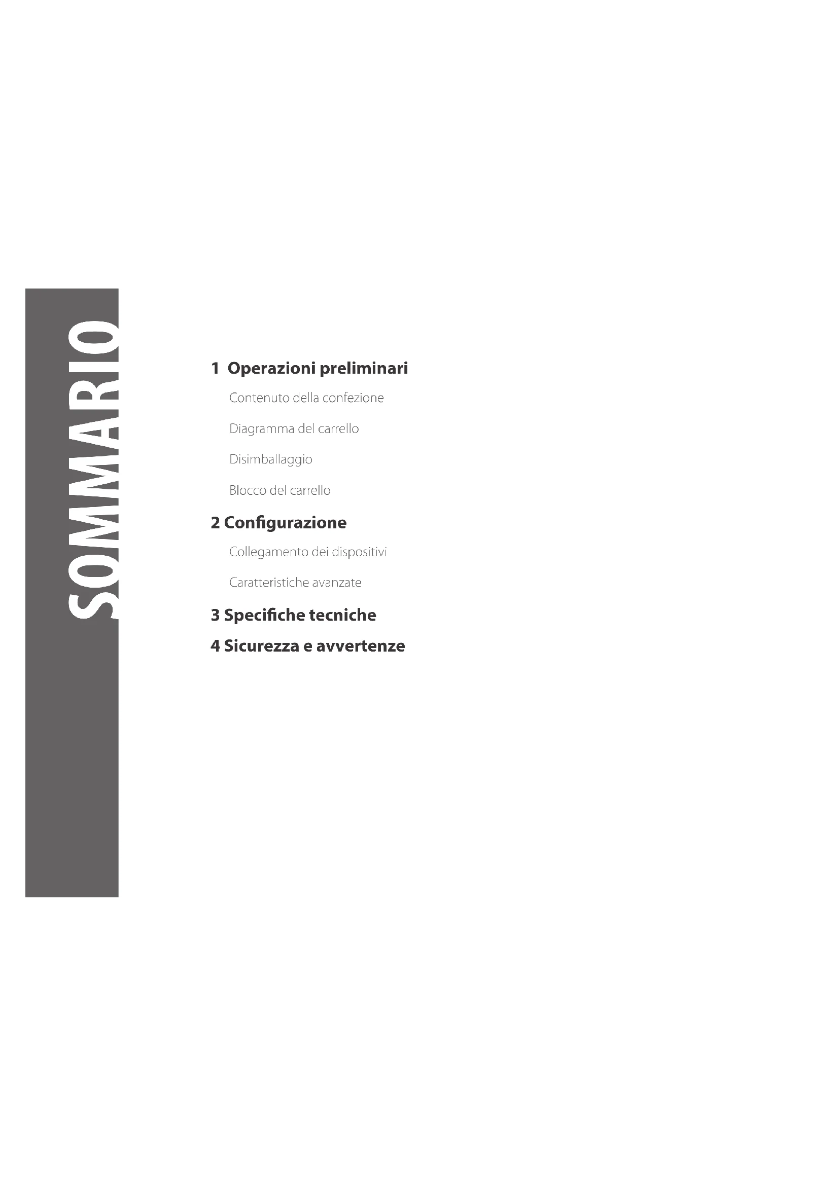 Carrello di ricarica1 Operazioni preliminari Contenuto della confezione Diagramma del carrello Disimballaggio Blocco del carrello 2 Congurazione Collegamento dei dispositivi Caratteristiche avanzate 3 Speciche tecniche 4 Sicurezza e avvertenze SOMMARIO1 OPERAZIONI PRELIMINARI Contenuto della confezione