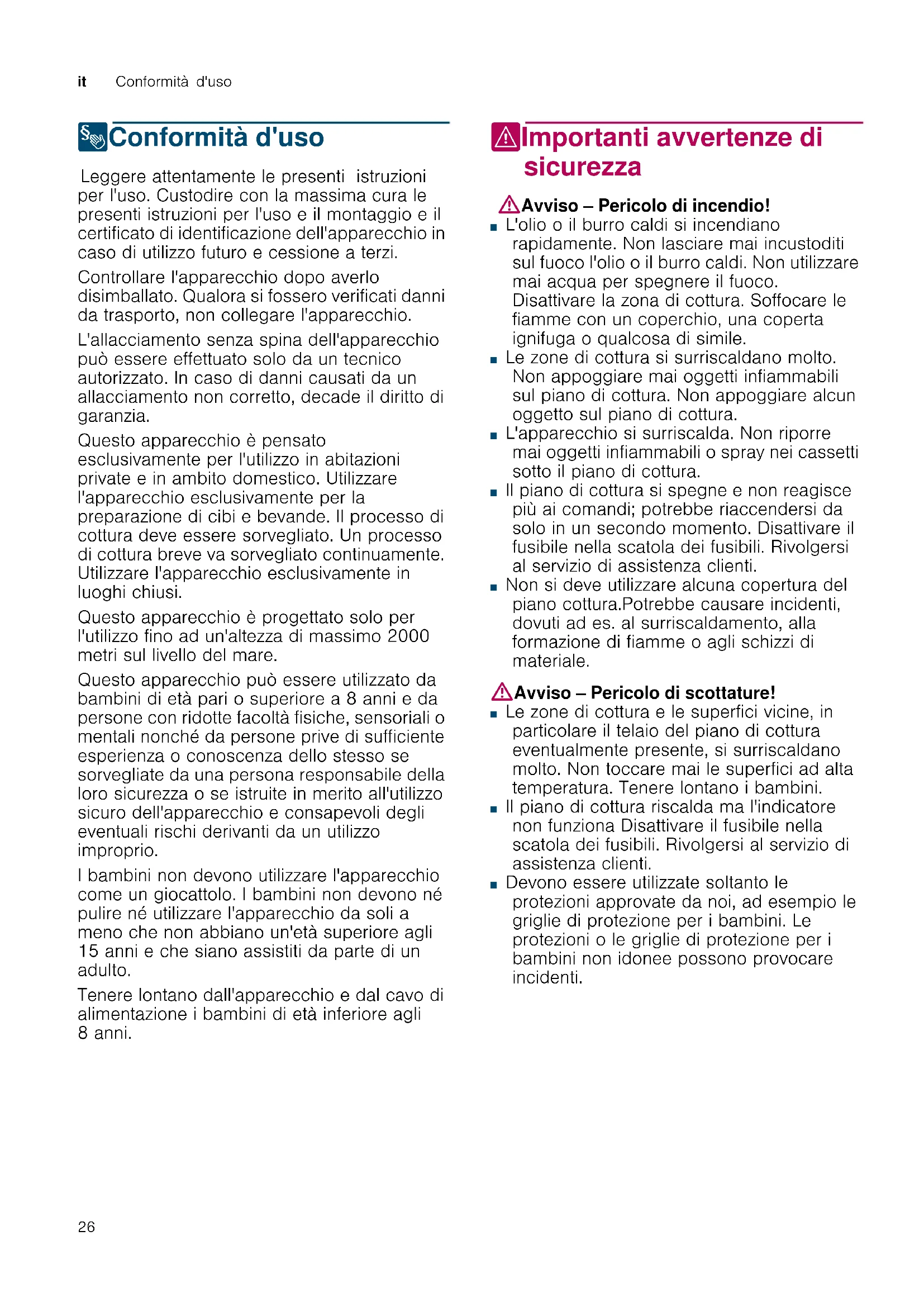8Conformità d'uso Co n f o r mità d' uso Leggere attentamente le presenti istruzioni per l'uso. Custodire con la massima cura le presenti istruzioni per l'uso e il montaggio e il certificato di identificazione dell'apparecchio in caso di utilizzo futuro e cessione a terzi. Controllare l'apparecchio dopo averlo disimballato. Qualora si fossero verificati danni da trasporto, non collegare l'apparecchio. L'allacciamento senza spina dell'apparecchio può essere effettuato solo da un tecnico autorizzato. In caso di danni causati da un allacciamento non corretto, decade il diritto di garanzia. Questo apparecchio è pensato esclusivamente per l'utilizzo in abitazioni private e in ambito domestico. Utilizzare l'apparecchio esclusivamente per la preparazione di cibi e bevande. Il processo di cottura deve essere sorvegliato. Un processo di cottura breve va sorvegliato continuamente. Utilizzare l'apparecchio esclusivamente in luoghi chiusi. Questo apparecchio è progettato solo per l'utilizzo fino ad un'altezza di massimo 2000 metri sul livello del mare. Questo apparecchio può essere utilizzato da bambini di età pari o superiore a 8 anni e da persone con ridotte facoltà fisiche, sensoriali o mentali nonché da persone prive di sufficiente esperienza o conoscenza dello stesso se sorvegliate da una persona responsabile della loro sicurezza o se istruite in merito all'utilizzo sicuro dell'apparecchio e consapevoli degli eventuali rischi derivanti da un utilizzo improprio. I bambini non devono utilizzare l'apparecchio come un giocattolo. I bambini non devono né pulire né utilizzare l'apparecchio da soli a meno che non abbiano un'età superiore agli 15 anni e che siano assistiti da parte di un adulto. Tenere lontano dall'apparecchio e dal cavo di alimentazione i bambini di età inferiore agli 8 anni. (Importanti avvertenze di sicurezza Impor t ant i avv er t enze di si cur ezza :Avviso – Pericolo di incendio! ■ L'olio o il burro caldi si incendiano rapidamente. Non lasciare mai incustoditi sul fuoco l'olio o il burro caldi. Non utilizzare mai acqua per spegnere il fuoco. Disattivare la zona di cottura. Soffocare le fiamme con un coperchio, una coperta ignifuga o qualcosa di simile. Pericolo di incendio! ■ Le zone di cottura si surriscaldano molto. Non appoggiare mai oggetti infiammabili sul piano di cottura. Non appoggiare alcun oggetto sul piano di cottura. Pericolo di incendio! ■ L'apparecchio si surriscalda. Non riporre mai oggetti infiammabili o spray nei cassetti sotto il piano di cottura. Pericolo di incendio! ■ Il piano di cottura si spegne e non reagisce più ai comandi; potrebbe riaccendersi da solo in un secondo momento. Disattivare il fusibile nella scatola dei fusibili. Rivolgersi al servizio di assistenza clienti. Pericolo di ustioni! ■ Non si deve utilizzare alcuna copertura del piano cottura.Potrebbe causare incidenti, dovuti ad es. al surriscaldamento, alla formazione di fiamme o agli schizzi di materiale. :Avviso – Pericolo di scottature! ■ Le zone di cottura e le superfici vicine, in particolare il telaio del piano di cottura eventualmente presente, si surriscaldano molto. Non toccare mai le superfici ad alta temperatura. Tenere lontano i bambini. Pericolo di scottature! ■ Il piano di cottura riscalda ma l'indicatore non funziona Disattivare il fusibile nella scatola dei fusibili. Rivolgersi al servizio di assistenza clienti. Pericolo di ustioni! ■ Devono essere utilizzate soltanto le protezioni approvate da noi, ad esempio le griglie di protezione per i bambini. Le protezioni o le griglie di protezione per i bambini non idonee possono provocare incidenti.Cause dei danni it