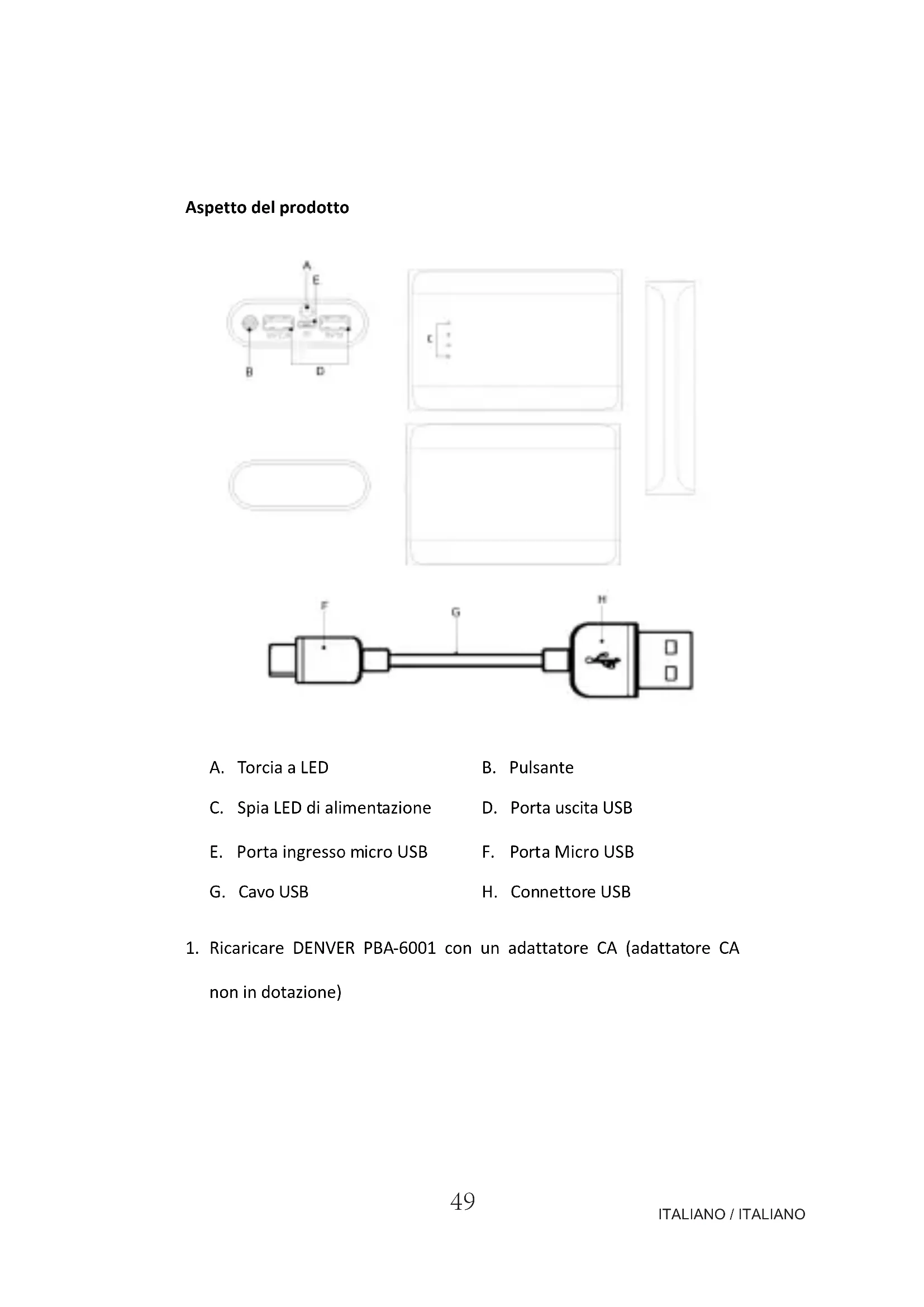 - Ricaricare DENVER PBA-6001 con un adattatore CA (adattatore CA non in dotazione)