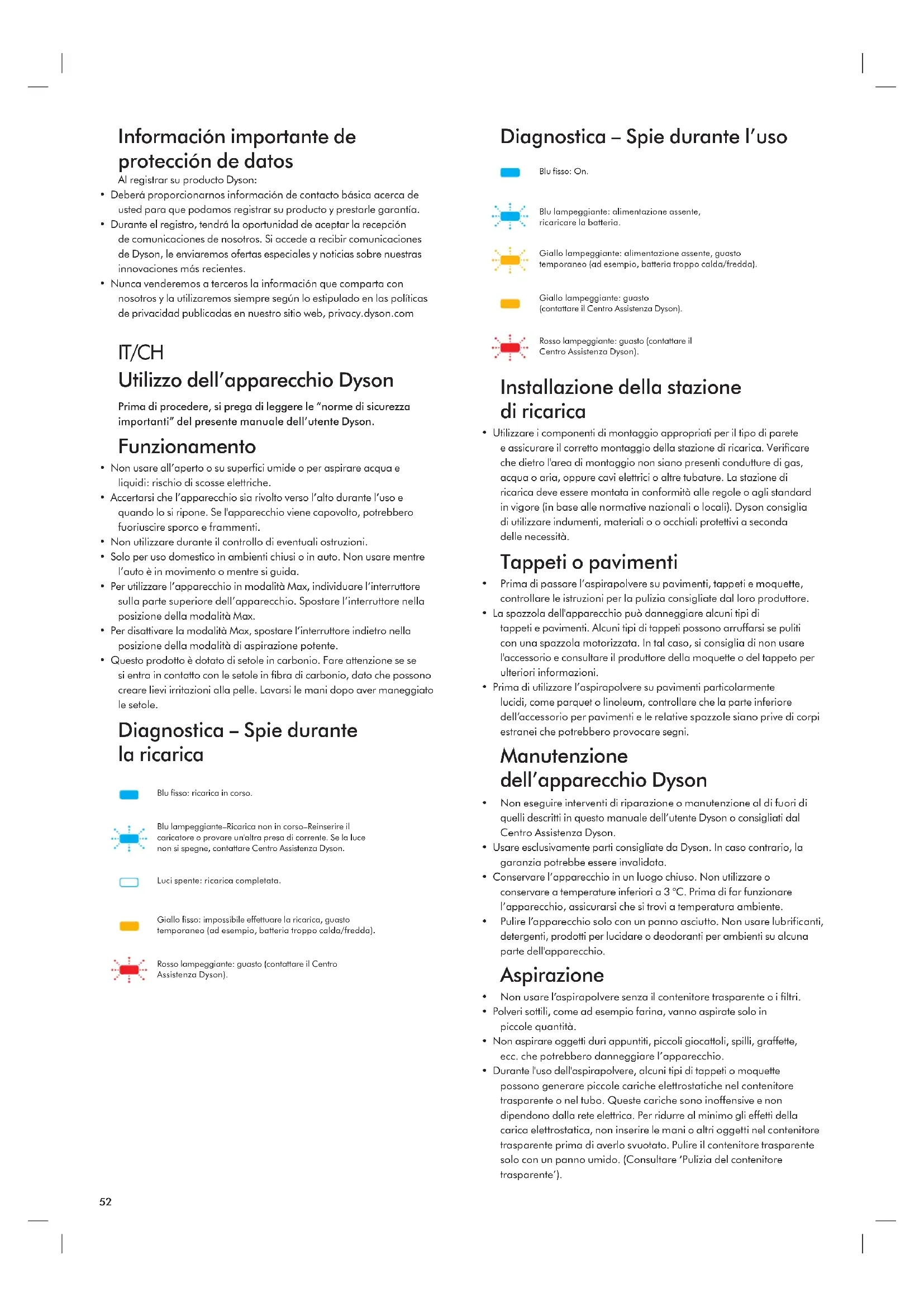 - Durante l'uso dell'aspirapolvere, alcuni tipi di tappeti o moquette possono generare piccole cariche elettrostatiche nel contenitore trasparente o nel tubo. Queste cariche sono inoffensive e non dipendono dalla rete elettrica. Per ridurre al minimo gli effetti della carica elettrostatica, non inserire le mani o altri oggetti nel contenitore trasparente prima di averlo svuotato. Pulire il contenitore trasparente solo con un panno umido. (Consultare ‘Pulizia del contenitore trasparente’). Blu fisso: ricarica in corso. Blu lampeggiante–Ricarica non in corso–Reinserire il caricatore o provare un'altra presa di corrente. Se la luce non si spegne, contattare Centro Assistenza Dyson. Luci spente: ricarica completata. Giallo fisso: impossibile effettuare la ricarica, guasto temporaneo (ad esempio, batteria troppo calda/fredda). Rosso lampeggiante: guasto (contattare il Centro Assistenza Dyson). Blu fisso: On. Blu lampeggiante: alimentazione assente, ricaricare la batteria. Giallo lampeggiante: alimentazione assente, guasto temporaneo (ad esempio, batteria troppo calda/fredda). Giallo lampeggiante: guasto (contattare il Centro Assistenza Dyson). Rosso lampeggiante: guasto (contattare il Centro Assistenza Dyson).53