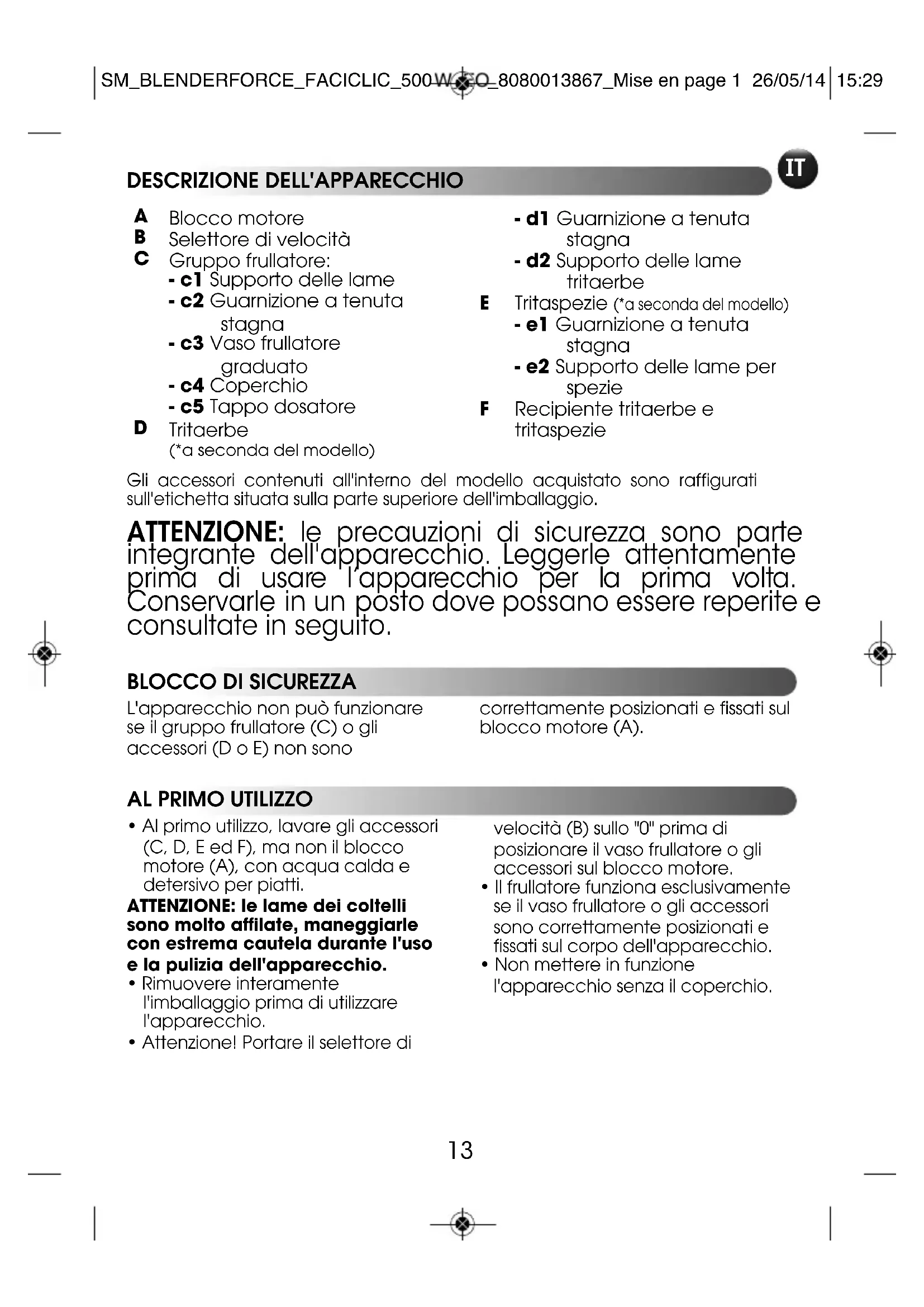 - Al primo utilizzo, lavare gli accessori(C, D, E ed F), ma non il bloccomotore (A), con acqua calda edetersivo per piatti.ATTENZIONE: le lame dei coltellisono molto affilate, maneggiarlecon estrema cautela durante l'usoe la pulizia dell'apparecchio.• Rimuovere interamentel'imballaggio prima di utilizzarel'apparecchio. • Attenzione! Portare il selettore divelocità (B) sullo "0" prima diposizionare il vaso frullatore o gliaccessori sul blocco motore.• Il frullatore funziona esclusivamentese il vaso frullatore o gli accessorisono correttamente posizionati efissati sul corpo dell'apparecchio.• Non mettere in funzionel'apparecchio senza il coperchio.L'apparecchio non può funzionarese il gruppo frullatore (C) o gliaccessori (D o E) non sonocorrettamente posizionati e fissati sulblocco motore (A). SM_BLENDERFORCE_FACICLIC_500W_EO_8080013867_Mise en page 1 26/05/14 15:2914