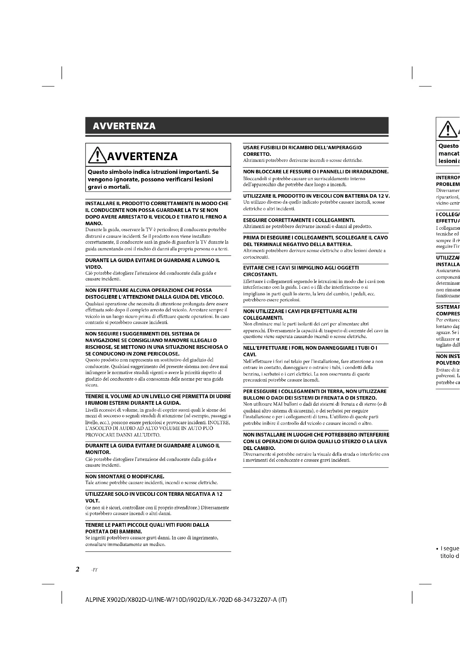 - Specifiche ALPINE X902D/X802D-U/INE-W710D/i902D/iLX-702D 68-34732Z07-A (IT) 2-IT AVVERTENZA AVVERTENZA Questo simbolo indica istruzioni importanti. Se vengono ignorate, possono verificarsi lesioni gravi o mortali. INSTALLARE IL PRODOTTO CORRETTAMENTE IN MODO CHE IL CONDUCENTE NON POSSA GUARDARE LA TV SE NON DOPO AVERE ARRESTATO IL VEICOLO E TIRATO IL FRENO A MANO. Durante la guida, osservare la TV è pericoloso; il conducente potrebbe distrarsi e causare incidenti. Se il prodotto non viene installato correttamente, il conducente sarà in grado di guardare la TV durante la guida aumentando così il rischio di danni alla propria persona o a terzi. DURANTE LA GUIDA EVITARE DI GUARDARE A LUNGO IL VIDEO. Ciò potrebbe distogliere l’attenzione del conducente dalla guida e causare incidenti. NON EFFETTUARE ALCUNA OPERAZIONE CHE POSSA DISTOGLIERE L’ATTENZIONE DALLA GUIDA DEL VEICOLO.Qualsiasi operazione che necessita di attenzione prolungata deve essere effettuata solo dopo il completo arresto del veicolo. Arrestare sempre il veicolo in un luogo sicuro prima di effettuare queste operazioni. In caso contrario si potrebbero causare incidenti. NON SEGUIRE I SUGGERIMENTI DEL SISTEMA DI NAVIGAZIONE SE CONSIGLIANO MANOVRE ILLEGALI O RISCHIOSE, SE METTONO IN UNA SITUAZIONE RISCHIOSA O SE CONDUCONO IN ZONE PERICOLOSE. Questo prodotto non rappresenta un sostitutivo del giudizio del conducente. Qualsiasi suggerimento del presente sistema non deve mai infrangere le normative stradali vigenti o avere la priorità rispetto al giudizio del conducente o alla conoscenza delle norme per una guida sicura. TENERE IL VOLUME AD UN LIVELLO CHE PERMETTA DI UDIRE I RUMORI ESTERNI DURANTE LA GUIDA.Livelli eccessivi di volume, in grado di coprire suoni quali le sirene dei mezzi di soccorso o segnali stradali di attenzione (ad esempio, passaggi a livello, ecc.), possono essere pericolosi e provocare incidenti. INOLTRE, L’ASCOLTO DI AUDIO AD ALTO VOLUME IN AUTO PUÒ PROVOCARE DANNI ALL’UDITO.DURANTE LA GUIDA EVITARE DI GUARDARE A LUNGO IL MONITOR. Ciò potrebbe distogliere l’attenzione del conducente dalla guida e causare incidenti. NON SMONTARE O MODIFICARE. Tale azione potrebbe causare incidenti, incendi o scosse elettriche.UTILIZZARE SOLO IN VEICOLI CON TERRA NEGATIVA A 12 VOLT.(se non si è sicuri, controllare con il proprio rivenditore.) Diversamente si potrebbero causare incendi o altri danni. TENERE LE PARTI PICCOLE QUALI VITI FUORI DALLA PORTATA DEI BAMBINI.Se ingeriti potrebbero causare gravi danni. In caso di ingerimento, consultare immediatamente un medico.USARE FUSIBILI DI RICAMBIO DELL’AMPERAGGIO CORRETTO.Altrimenti potrebbero derivarne incendi o scosse elettriche. NON BLOCCARE LE FESSURE O I PANNELLI DI IRRADIAZIONE. Bloccandoli si potrebbe causare un surriscaldamento interno dell’apparecchio che potrebbe dare luogo a incendi. UTILIZZARE IL PRODOTTO IN VEICOLI CON BATTERIA DA 12 V. Un utilizzo diverso da quello indicato potrebbe causare incendi, scosse elettriche o altri incidenti. ESEGUIRE CORRETTAMENTE I COLLEGAMENTI. Altrimenti ne potrebbero derivarne incendi o danni al prodotto. PRIMA DI ESEGUIRE I COLLEGAMENTI, SCOLLEGARE IL CAVO DEL TERMINALE NEGATIVO DELLA BATTERIA. Altrimenti potrebbero derivare scosse elettriche o altre lesioni dovute a cortocircuiti. EVITARE CHE I CAVI SI IMPIGLINO AGLI OGGETTI CIRCOSTANTI. Effettuare i collegamenti seguendo le istruzioni in modo che i cavi non interferiscano con la guida. I cavi o i fili che interferiscono o si impigliano in parti quali lo sterzo, la leva del cambio, i pedali, ecc. potrebbero essere pericolosi. NON UTILIZZARE I CAVI PER EFFETTUARE ALTRI COLLEGAMENTI. Non eliminare mai le parti isolanti dei cavi per alimentare altri apparecchi. Diversamente la capacità di trasporto di corrente del cavo in questione viene superata causando incendi o scosse elettriche. NELL’EFFETTUARE I FORI, NON DANNEGGIARE I TUBI O I CAVI. Nell’effettuare i fori nel telaio per l’installazione, fare attenzione a non entrare in contatto, danneggiare o ostruire i tubi, i condotti della benzina, i serbatoi o i cavi elettrici. La non osservanza di queste precauzioni potrebbe causare incendi. PER ESEGUIRE I COLLEGAMENTI DI TERRA, NON UTILIZZARE BULLONI O DADI DEI SISTEMI DI FRENATA O DI STERZO. Non utilizzare MAI bulloni o dadi dei sistemi di frenata e di sterzo (o di qualsiasi altro sistema di sicurezza), o dei serbatoi per eseguire l’installazione o per i collegamenti di terra. L’utilizzo di queste parti potrebbe inibire il controllo del veicolo e causare incendi o altro.NON INSTALLARE IN LUOGHI CHE POTREBBERO INTERFERIRE CON LE OPERAZIONI DI GUIDA QUALI LO STERZO O LA LEVA DEL CAMBIO. Diversamente si potrebbe ostruire la visuale della strada o interferire con i movimenti del conducente e causare gravi incidenti. p. 17