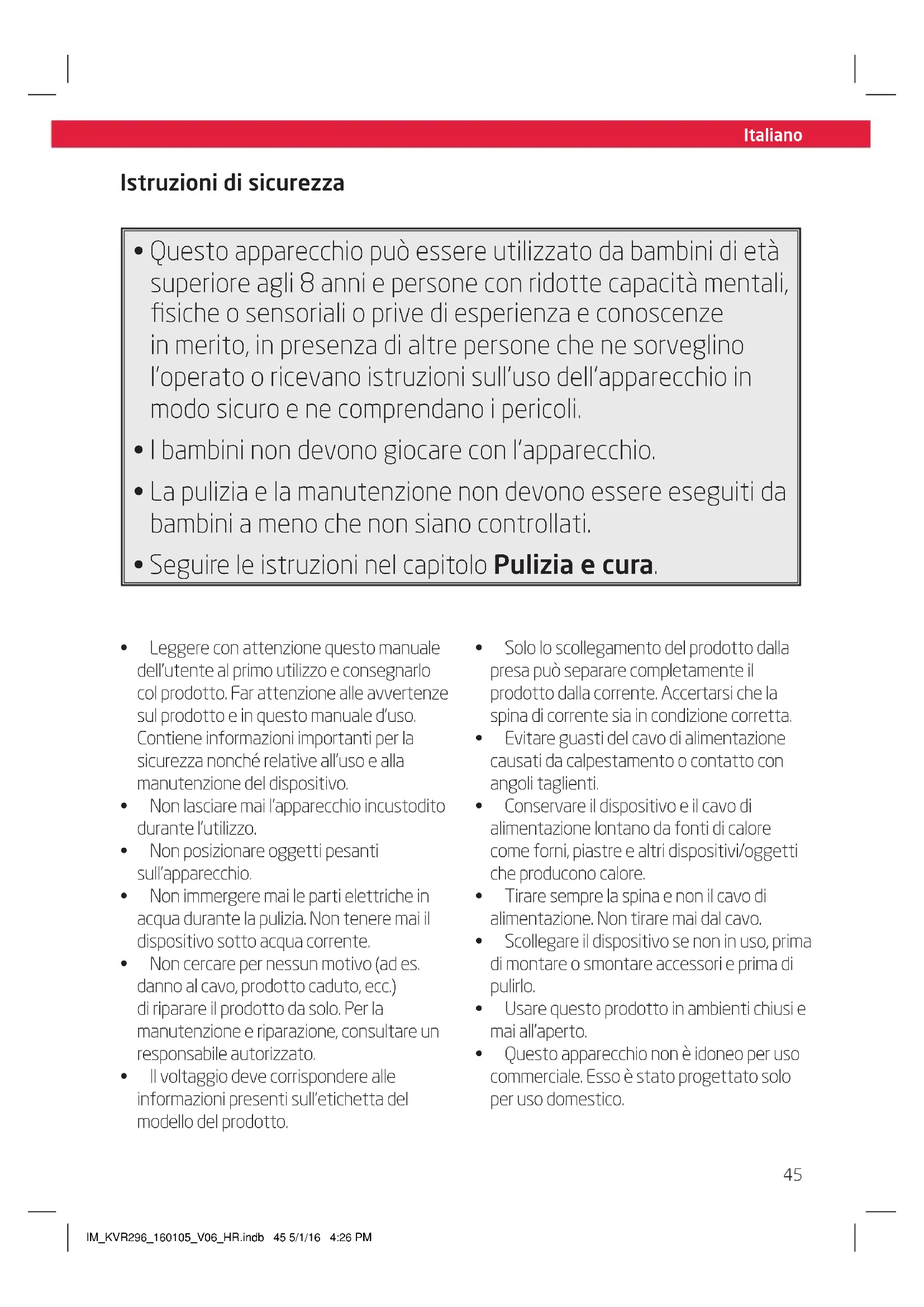 - Questo apparecchio non è idoneo per uso commerciale. Esso è stato progettato solo per uso domestico. IM_KVR296_160105_V06_HR.indb 45 5/1/16 4:26 PMItaliano