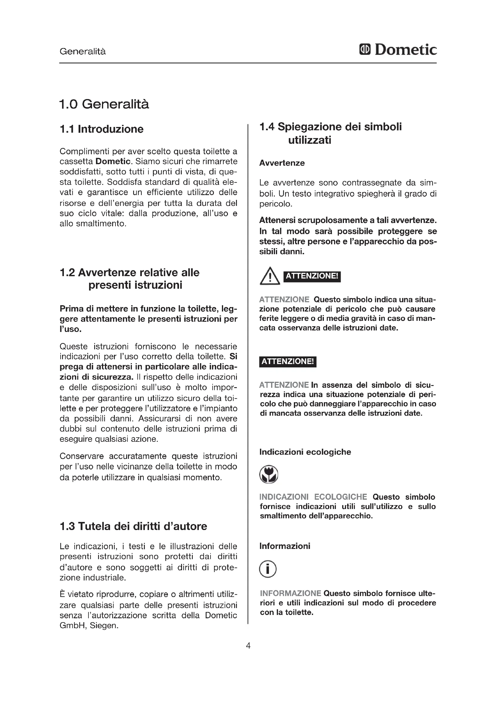 Complimenti per aver scelto questa toilette a cassetta Dometic. Siamo sicuri che rimarrete soddisfatti, sotto tutti i punti di vista, di que- sta toilette. Soddisfa standard di qualità ele- vati e garantisce un efficiente utilizzo delle risorse e dell’energia per tutta la durata del suo ciclo vitale: dalla produzione, all’uso e allo smaltimento.