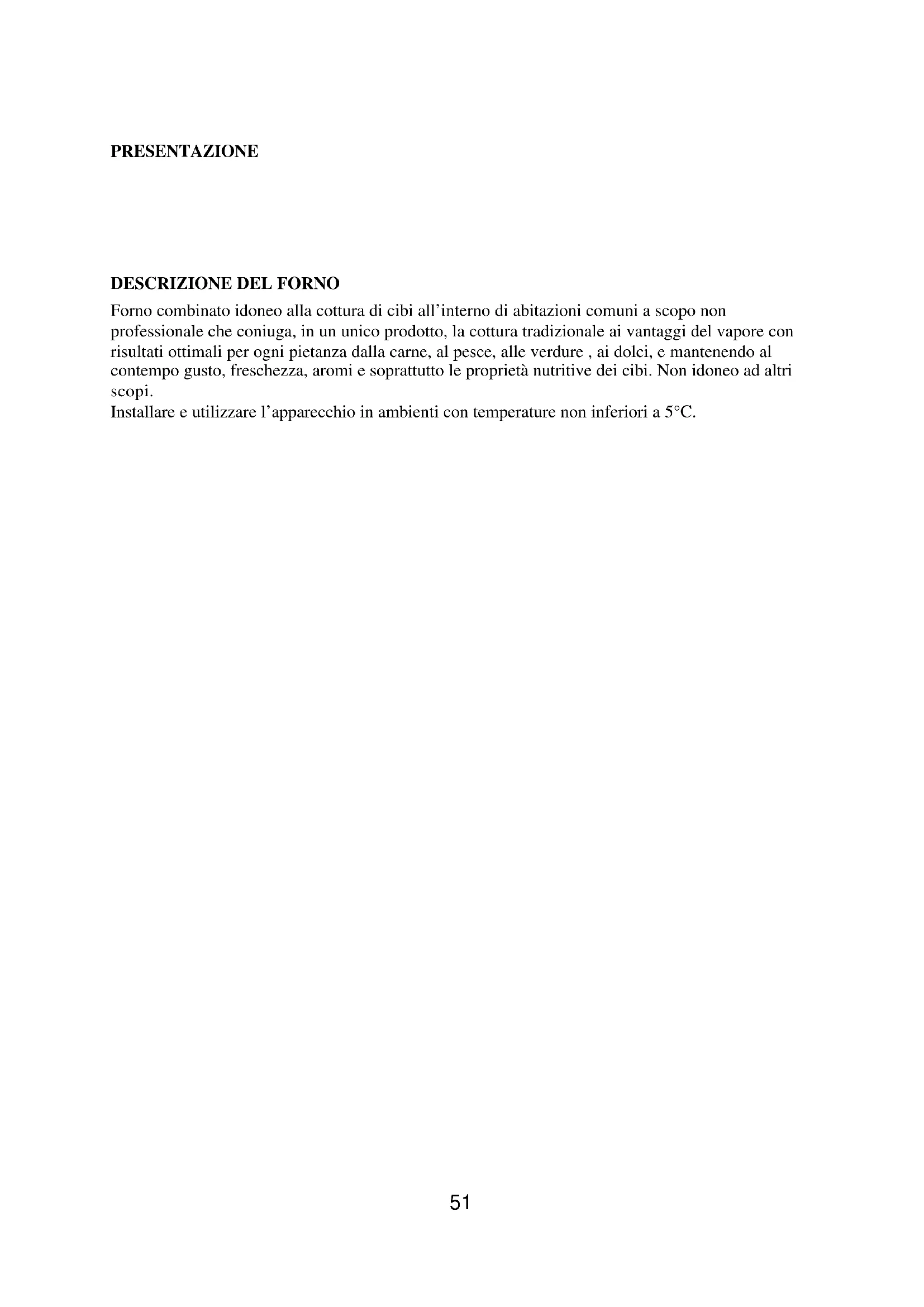 Forno combinato idoneo alla cottura di cibi all’interno di abitazioni comuni a scopo non professionale che coniuga, in un unico prodotto, la cottura tradizionale ai vantaggi del vapore con risultati ottimali per ogni pietanza dalla carne, al pesce, alle verdure , ai dolci, e mantenendo al contempo gusto, freschezza, aromi e soprattutto le proprietà nutritive dei cibi. Non idoneo ad altri scopi. Installare e utilizzare l’apparecchio in ambienti con temperature non inferiori a 5°C.