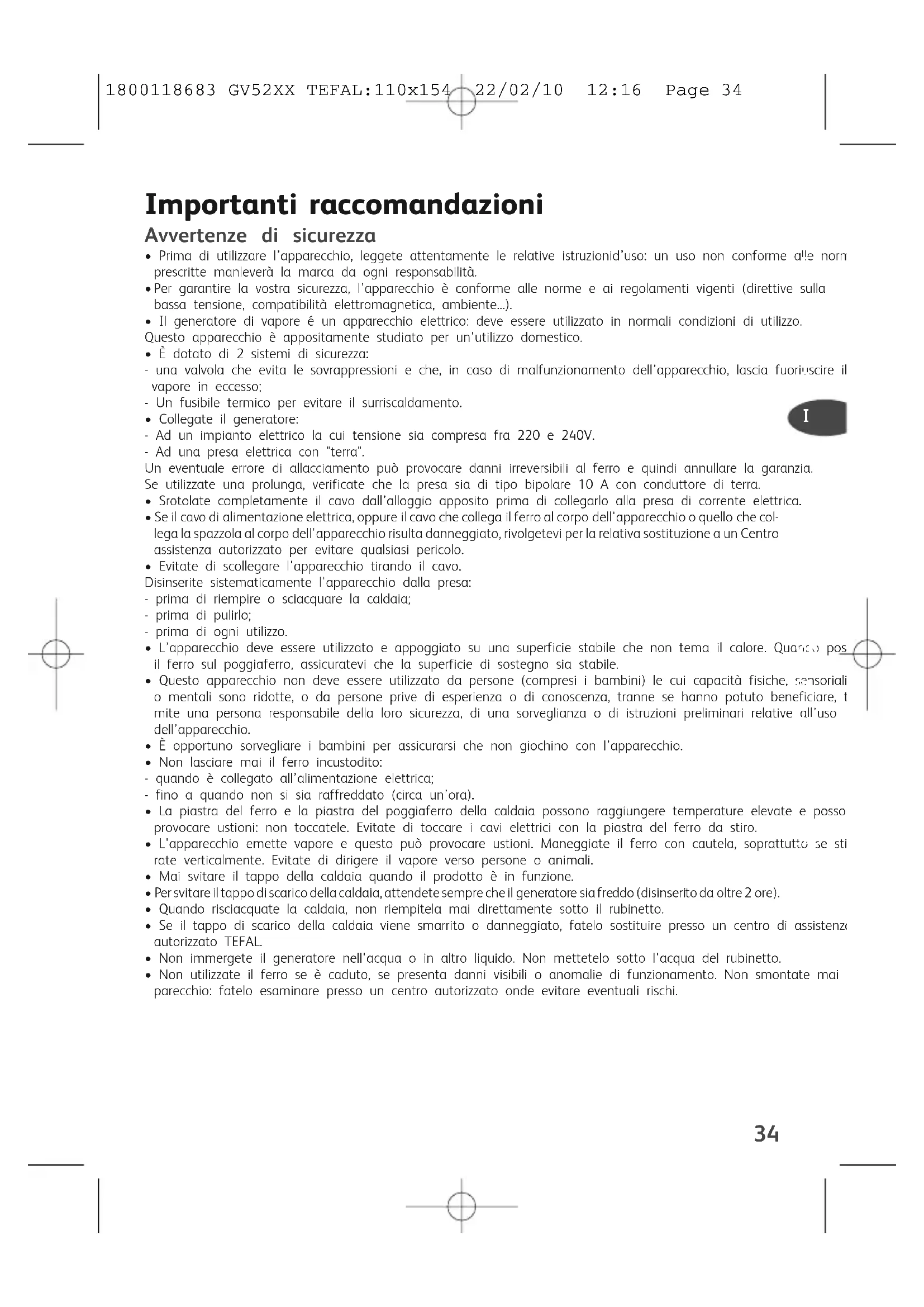 - Collegate il generatore: - Ad un impianto elettrico la cui tensione sia compresa fra 220 e 240V. - Ad una presa elettrica con "terra". Un eventuale errore di allacciamento può provocare danni irreversibili al ferro e quindi annullare la garanzia. Se utilizzate una prolunga, verificate che la presa sia di tipo bipolare 10 A con conduttore di terra.